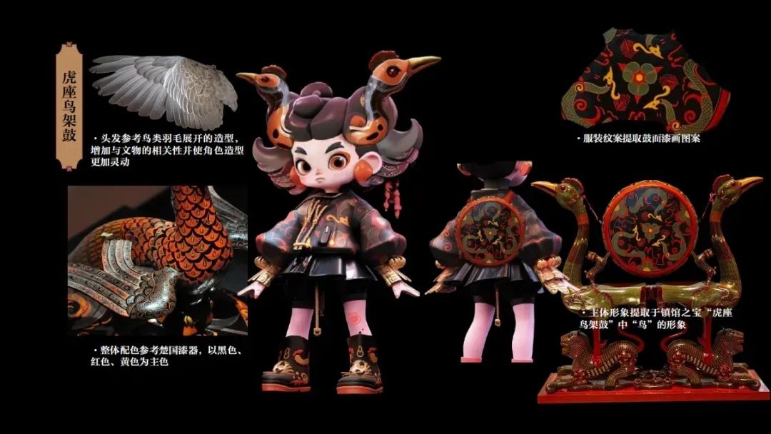 同样出现在世界数字教育大会观摩点的AI文物精灵“楚音”,是以湖北省博物馆另外一个镇馆之宝——虎座鸟架鼓为原型。