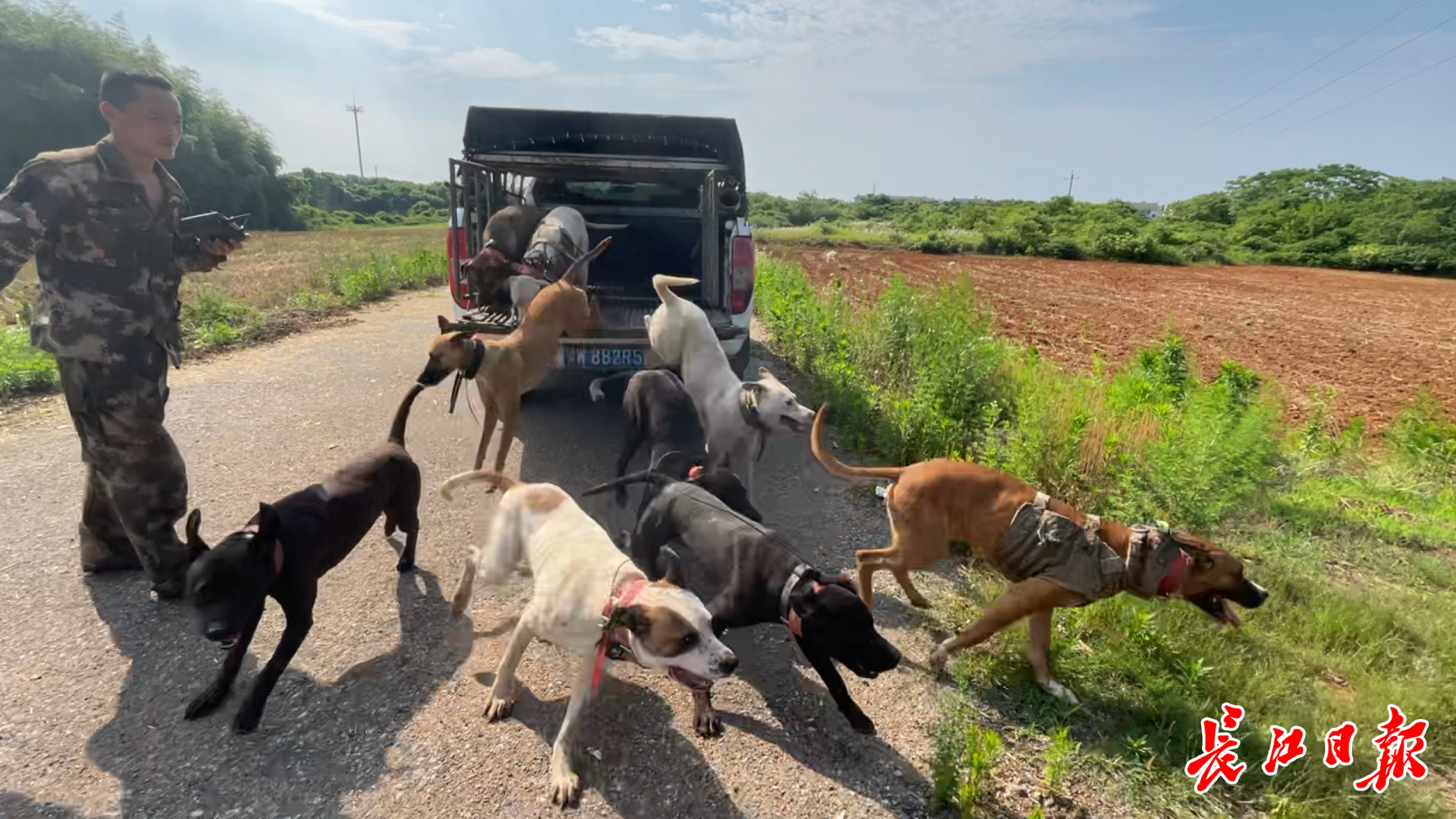 9时,山林内气温升至30多摄氏度,两名一线狩猎队员的迷彩服早已湿透。荆棘划伤了手臂,茅草叶边缘锋利,稍不注意就会割破皮肤。猎狗喘息声越来越重,但仍在奋力搜寻。