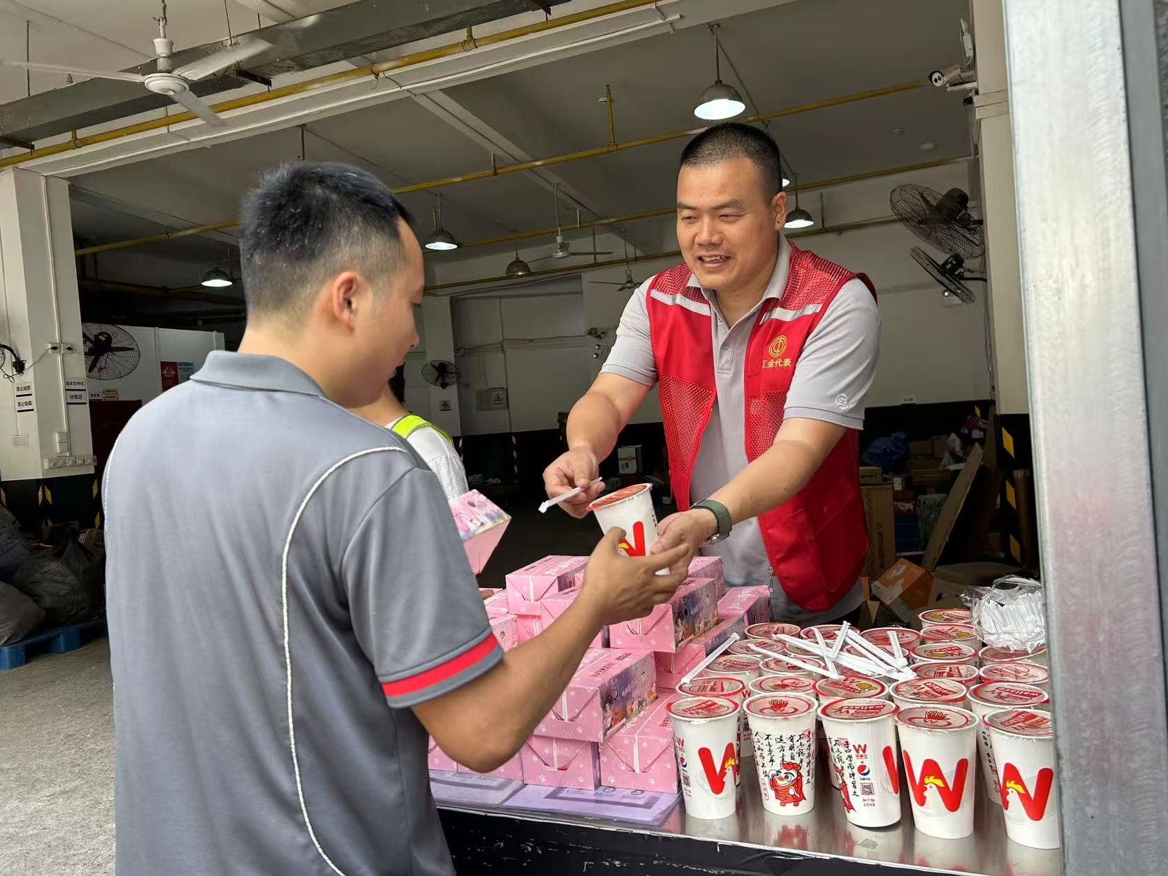5月19日,汪勇在武昌区为顺丰快递小哥送汉堡套餐。