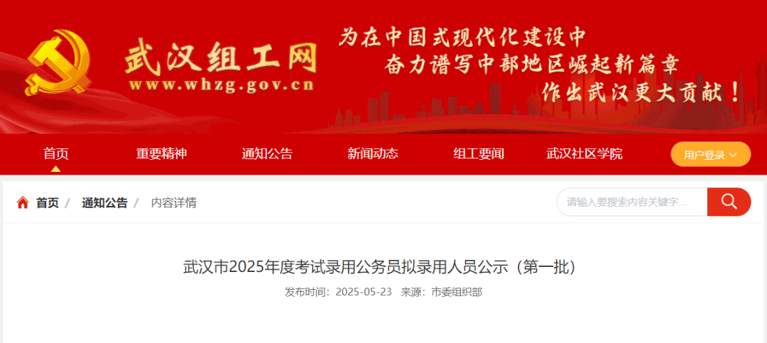 5月23日,武汉组工网发布《武汉市2025年度考试录用公务员拟录用人员公示(第一批)》,具体如下: