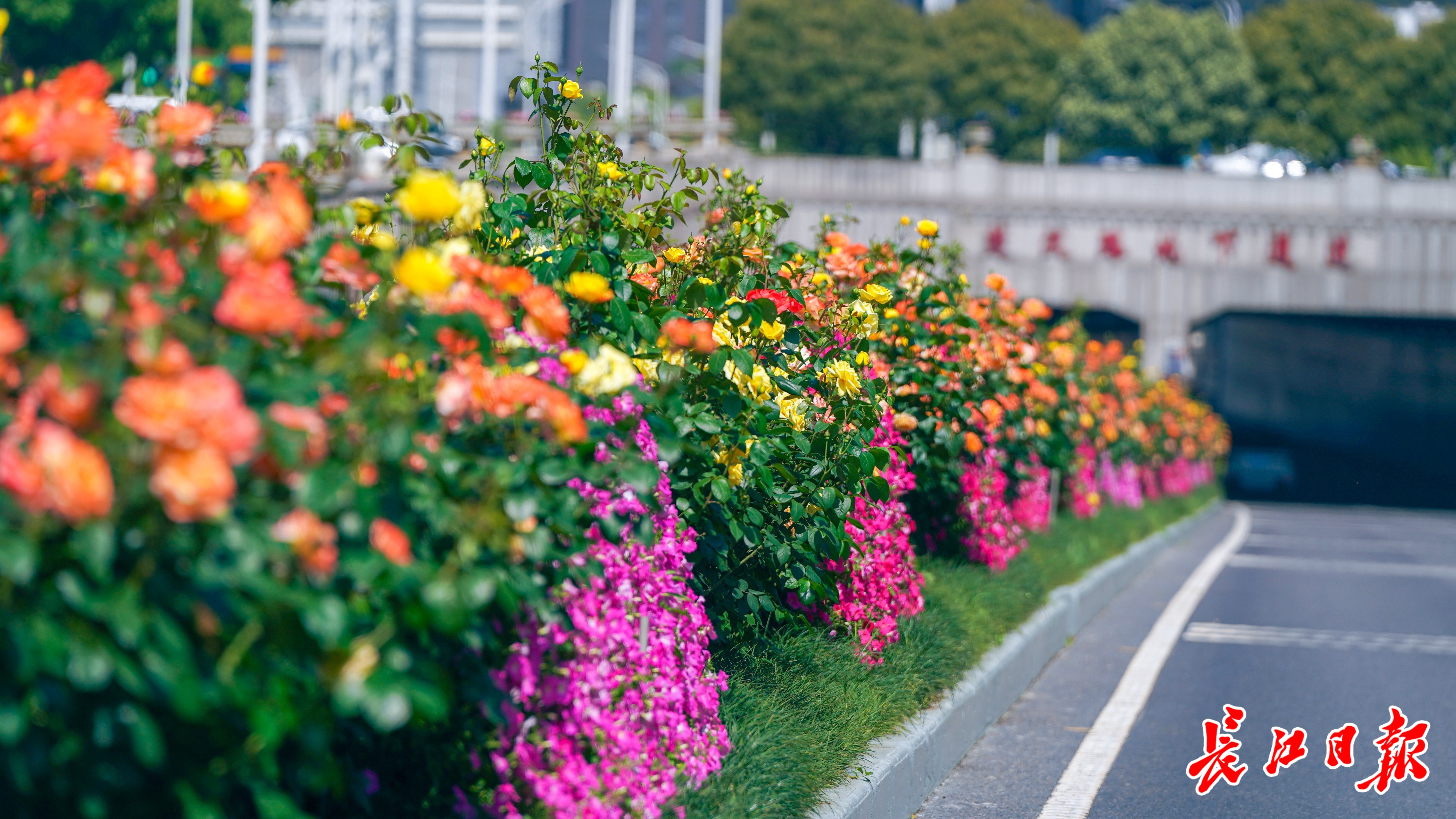 武昌区绿化队副队长王建红介绍,中分带内选种的是藤本月季“光谱”,花量大、花期长、色彩丰富。每株月季可开出红、白、黄、粉、橙等颜色的花朵,是摄影爱好者最喜欢飞拍的点位。