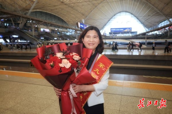 长江日报大武汉客户端5月24日讯(记者高萌)5月24日12时许,第九届全国道德模范、武汉市肺科医院副院长杜荣辉乘高铁抵汉。她刚一走出武汉站西出站口,便被热情迎候的人们包围。
