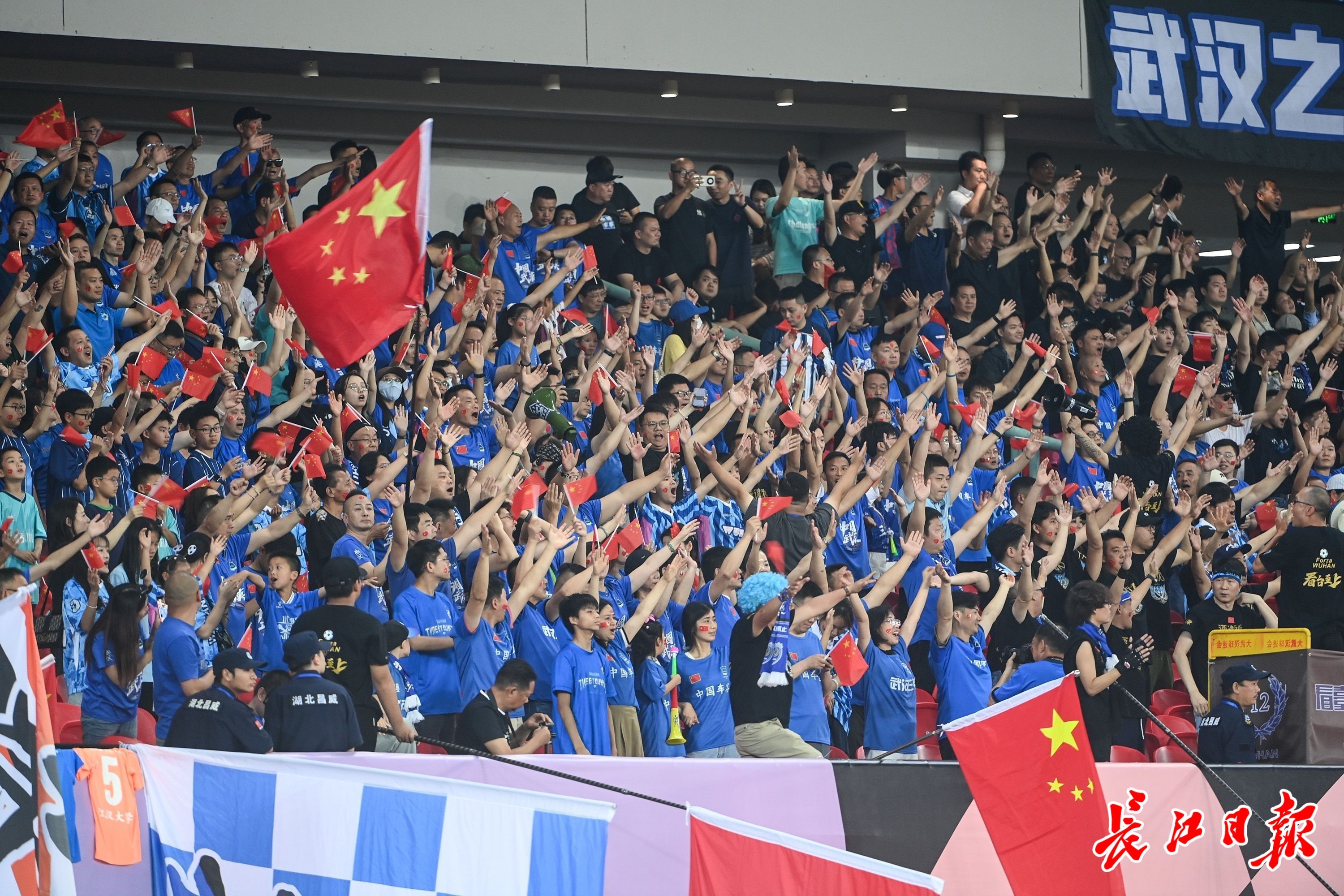 5月24日晚,现场观众为中国武汉车谷江大女足加油。