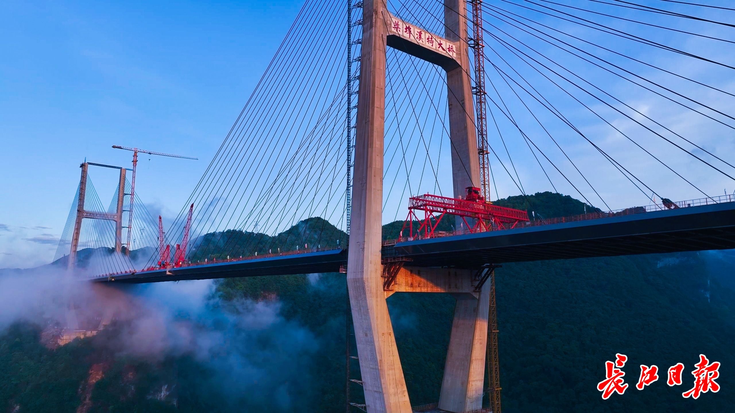 上午10时,记者来到柴埠溪特大桥合龙现场。天空湛蓝,几朵白云从头顶悠悠飘过,阳光洒在峡谷之间,大桥的钢梁结构在光的照耀下熠熠生辉。几台大型起重机稳稳地伫立在桥上,长长的吊臂高高扬起,其他各种施工机械也纷纷就位。
