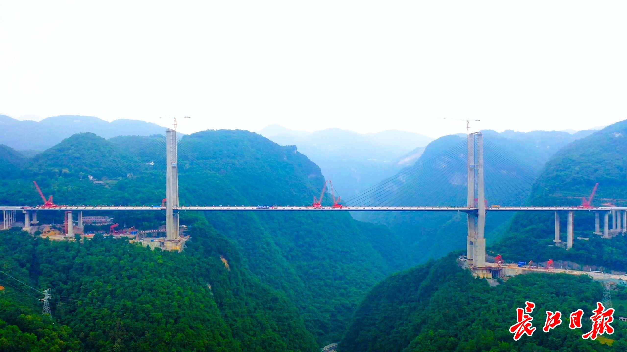 从远处望去,合龙后的柴埠溪特大桥如一道绚丽的彩虹横跨在峡谷之上,与周边的山水相得益彰。