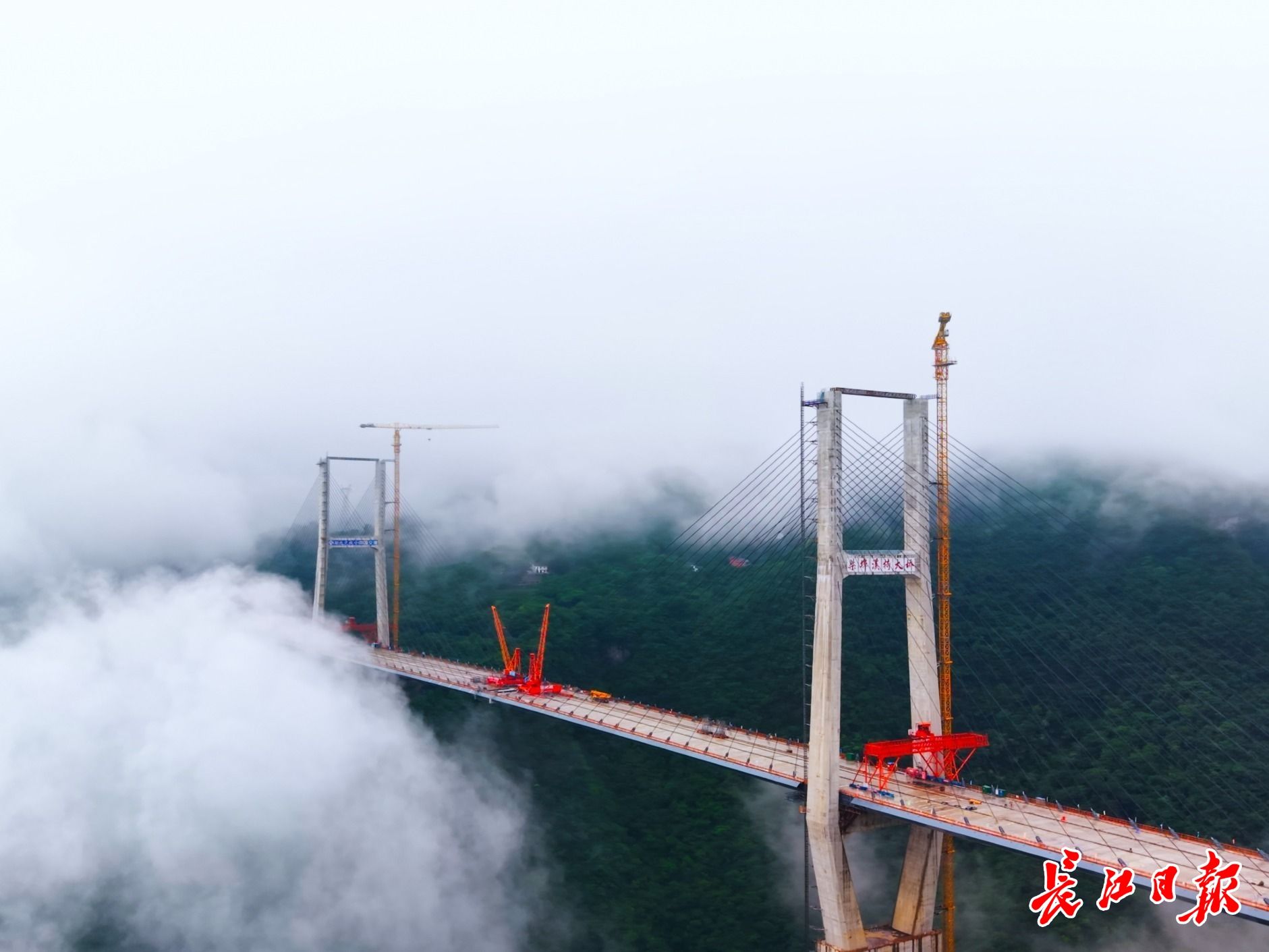 “这好比在云端之上‘拼积木’。”中交二航局宜来高速项目常务副经理刘海军介绍,由于特大桥位于鄂西南武陵山腹地,昼夜温差最高可达22℃,合龙口宽度变化大,因此实现毫米级精准合龙的难度极大。工程共用了152根斜拉索,270种、819块桥面板,2560个钢结构构件,45.5万个连接构件。
