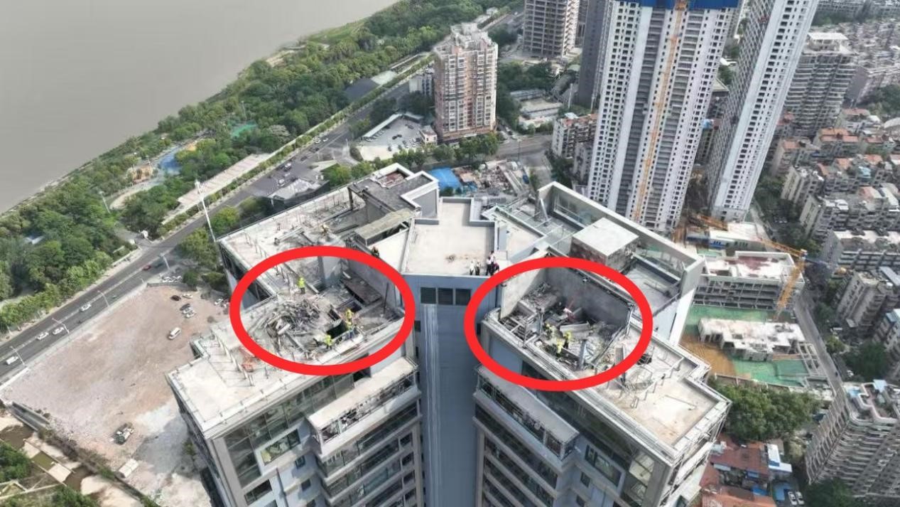 中海寰宇天下天钻项目顶楼违建(画圈处)被拆除。