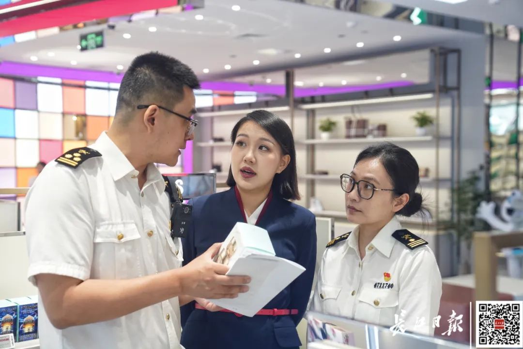 试营业首日,武汉海关工作人员现场进一步查验商品资质等情况。