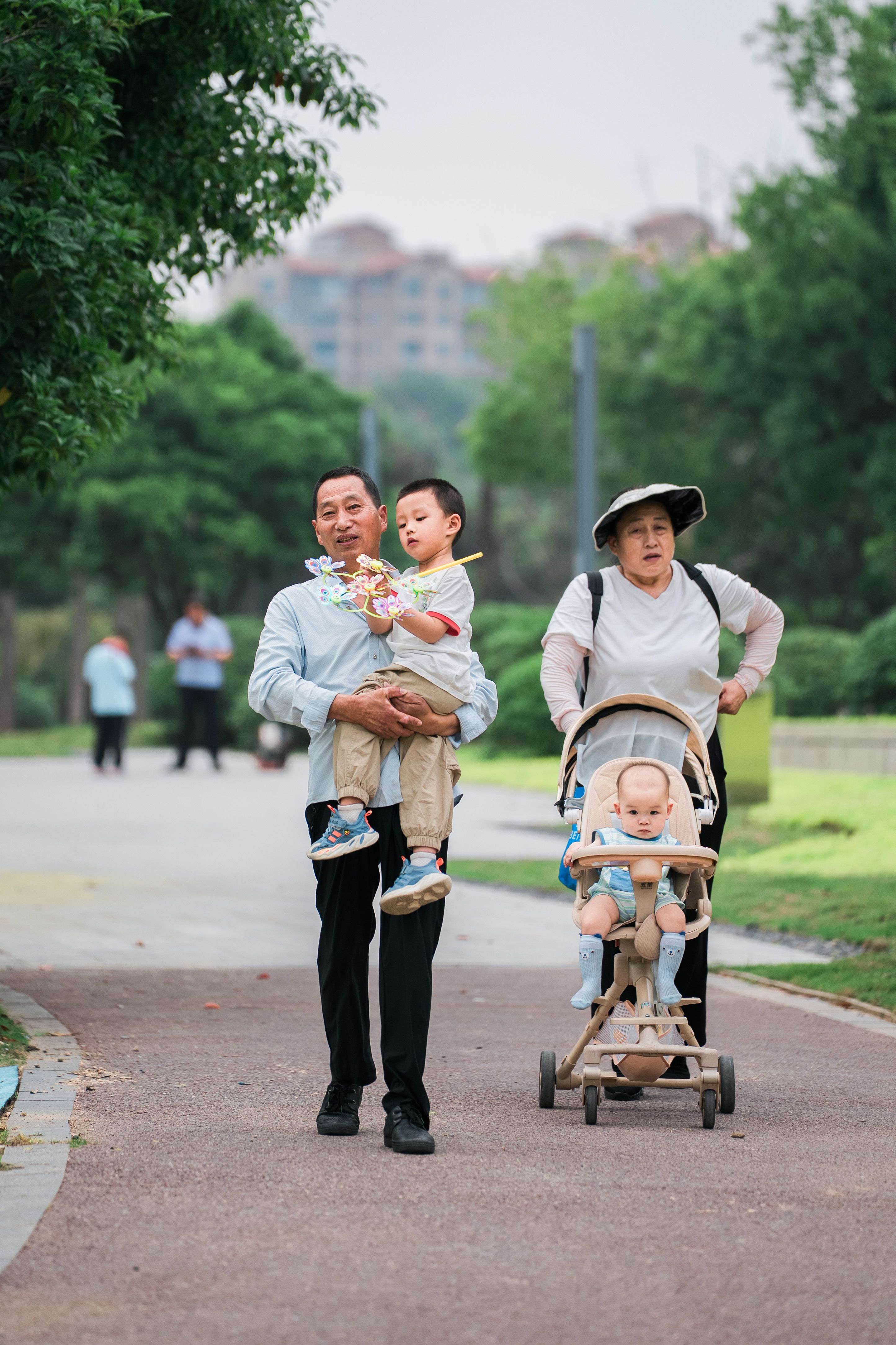 在树阵广场旁边的沙坑城堡游乐区,几位家长正带着孩子在玩耍。70岁的市民邓先生一边推着孙子荡秋千,一边说笑,逗得孙子咯咯咯地笑。