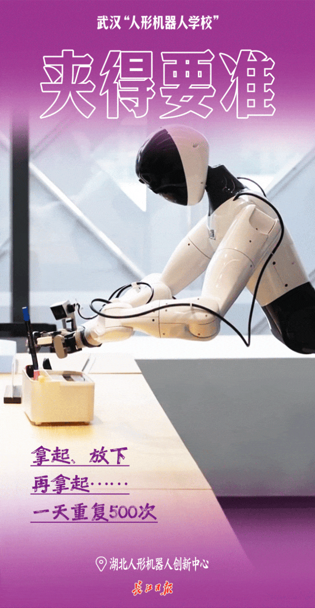 与其说这里是人形机器人的动作训练场和数据采集场,不如说是一座人形机器人“学校”。无论是人形机器人还是从武汉生物工程学院等湖北高校机器人工程专业招募来的数据采集员们,都是边探索边学习。拿起、放下,拿起、再放下……记者注意到,一个简单的“夹瓶子”的动作,数据采集员和人形机器人“学员”一天就要重复500次。
