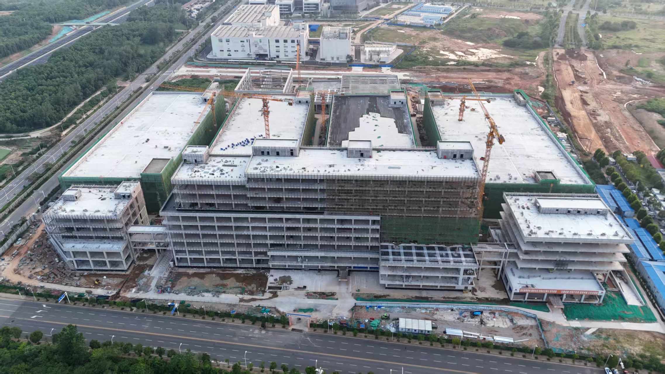 记者现场看到,7台塔吊如钢铁巨人般挥舞长臂,工人正戴着防尘面罩在一栋研发厂房屋顶铺设防水卷材。多栋生产调度厂房的玻璃幕墙龙骨已勾勒出建筑轮廓,生产厂房都已封顶。