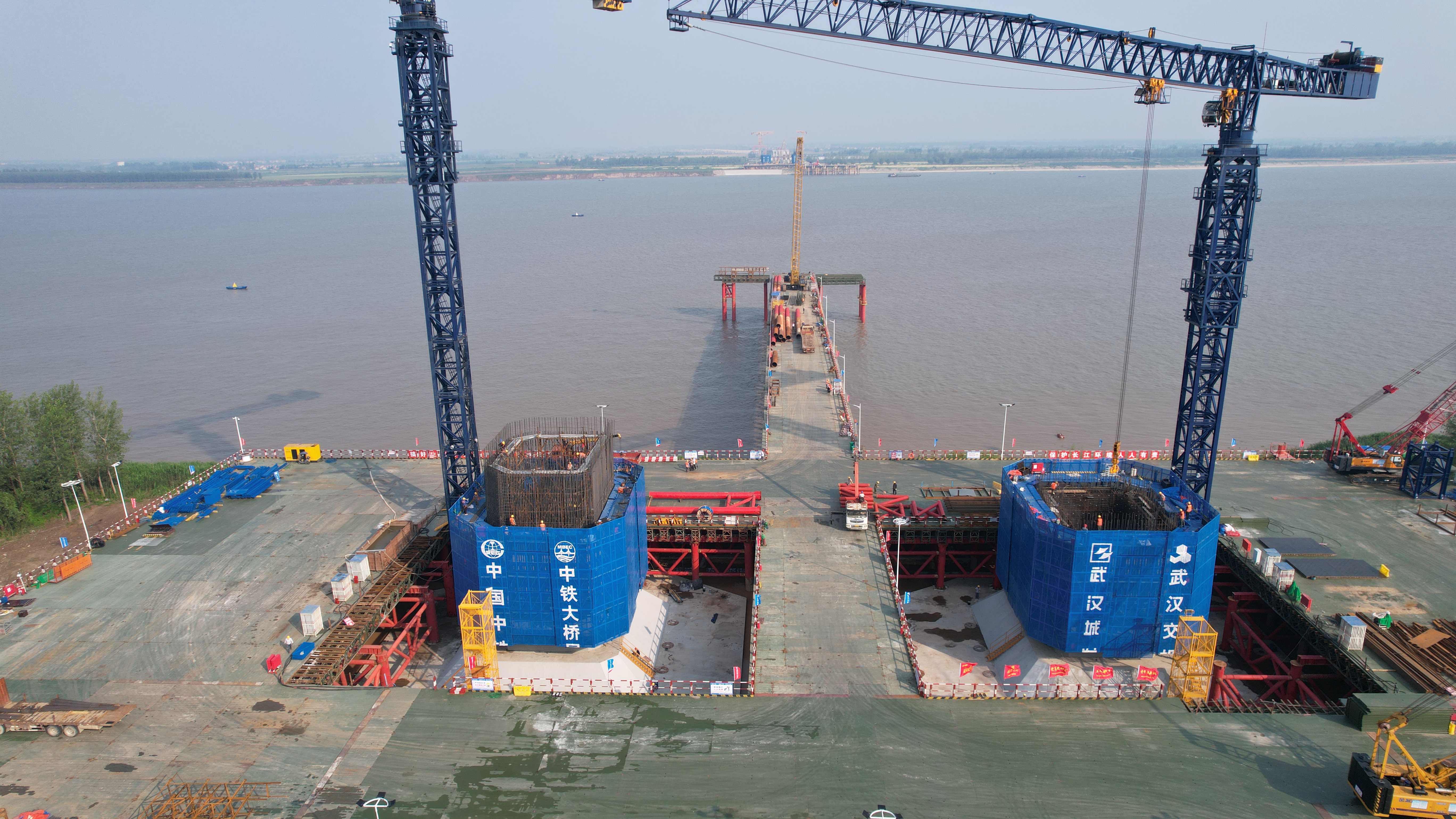 长江日报记者看到,在该施工现场不到1公里的长江江畔,机械轰鸣、塔吊林立,汉南长江大桥北岸主塔正在进行基础施工。施工人员称,北主塔高度已突破15米,明年上半年完成塔身混凝土浇筑,实现封顶。