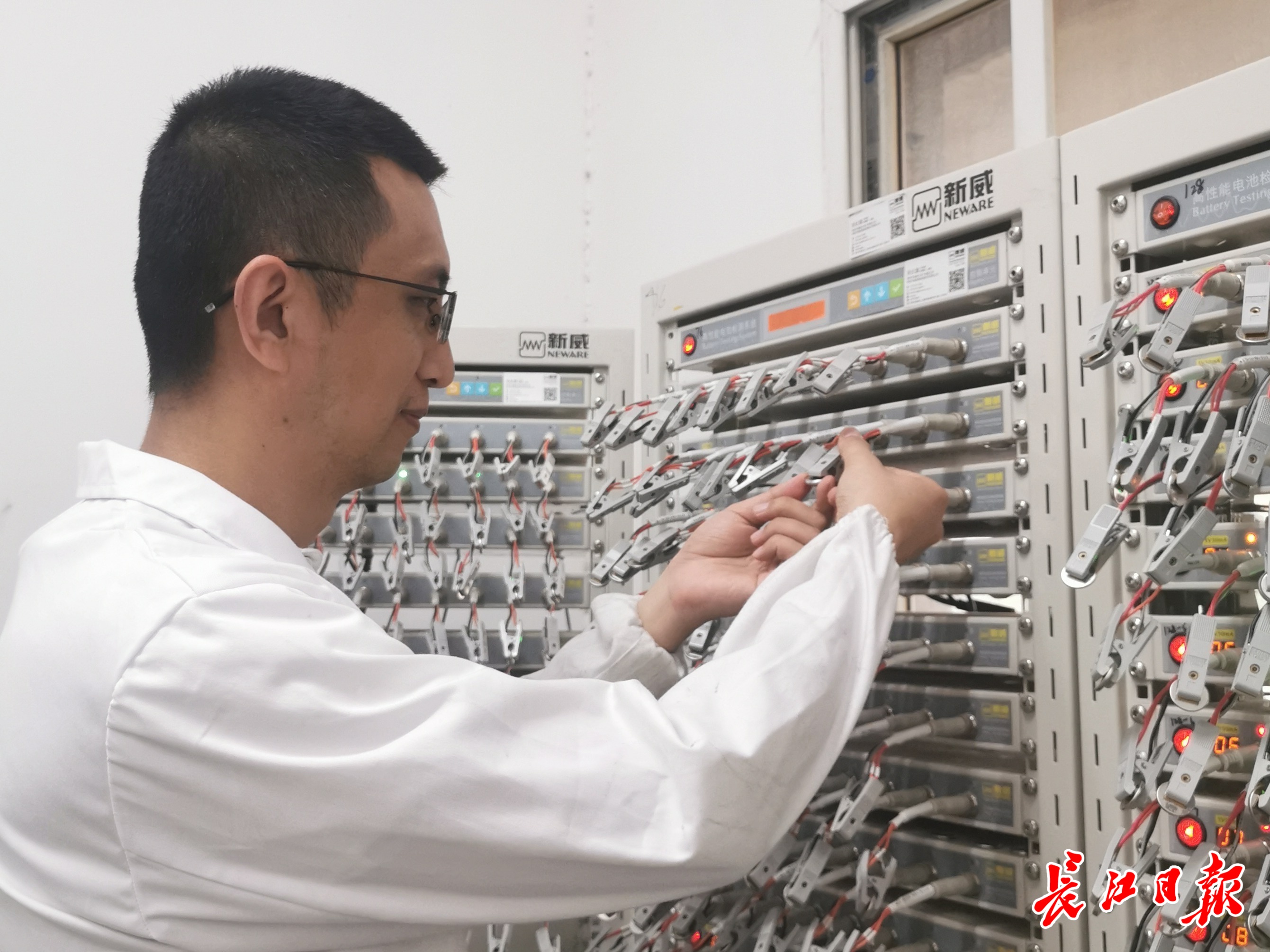在华中师范大学纳米科技研究院实验室内,归国博士后杨泽副教授将一个个硬币大小的钠离子电池夹在密密麻麻的检测夹上,检测这些钠离子电池是否达到性能要求。