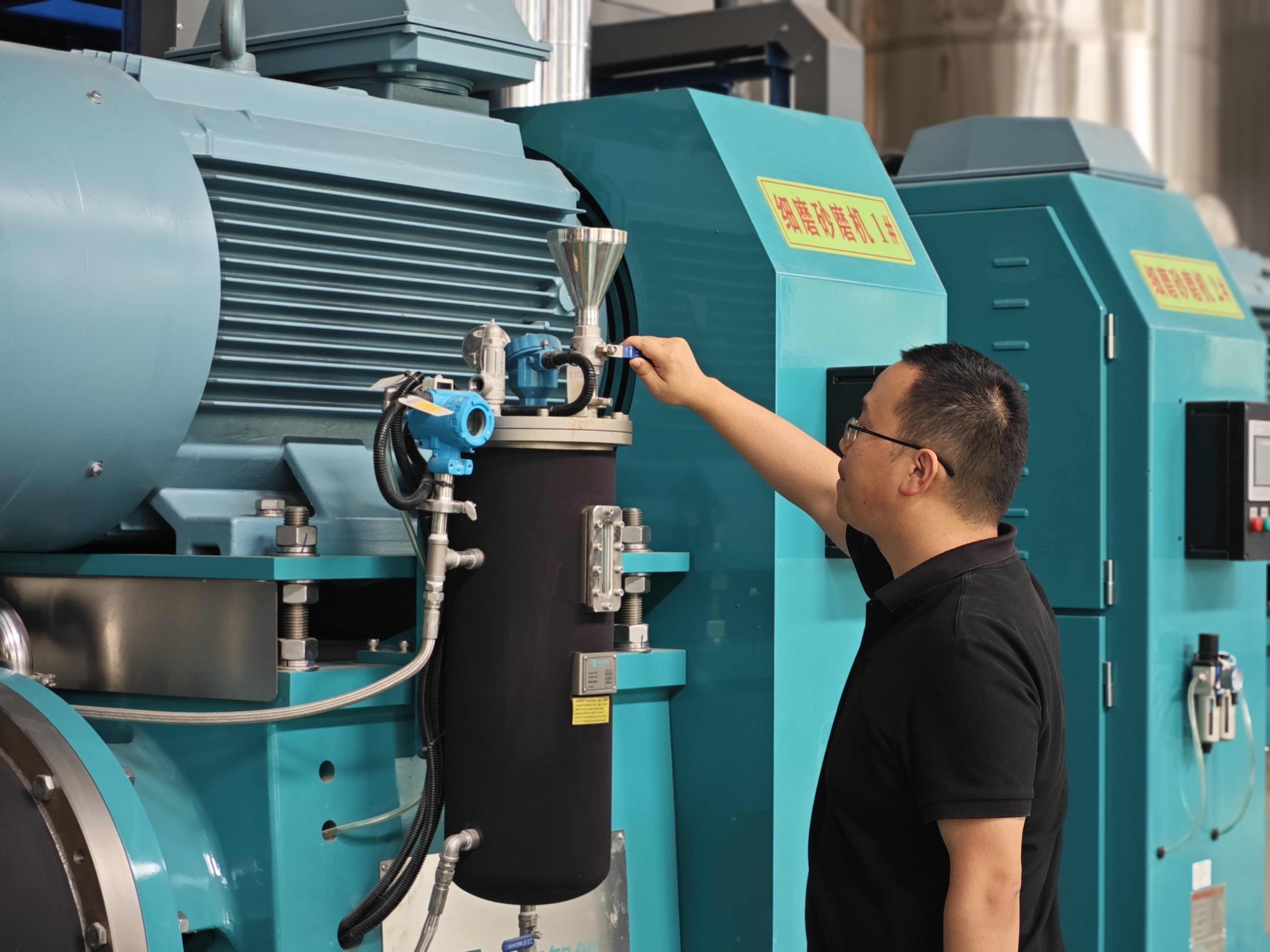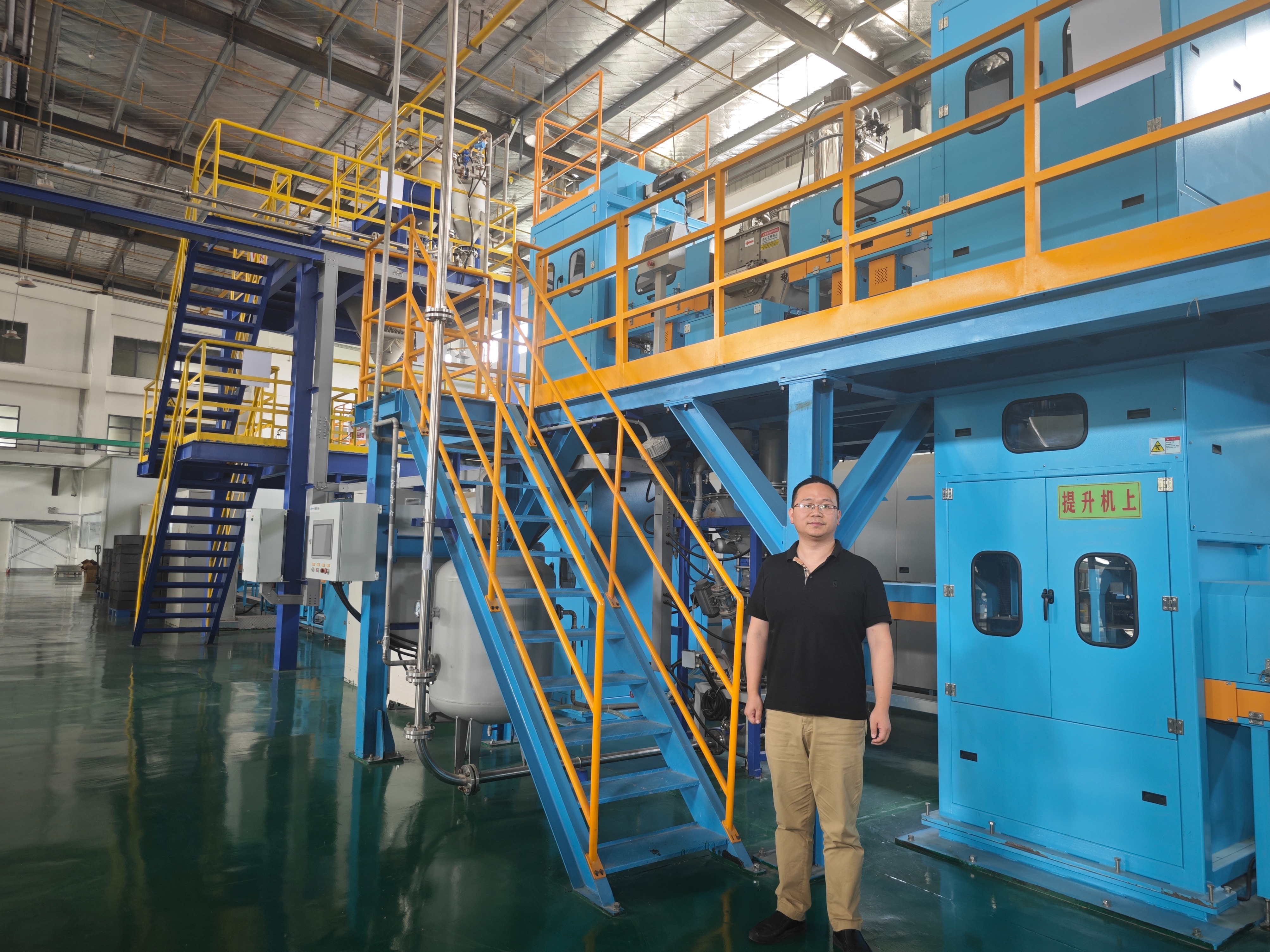 胡培正在查看世界首条钠离子电池正极材料生产线的生产情况。