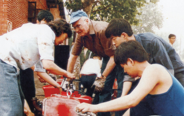 李兵捐赠的这张照片显示,1985年6月18日,在武汉柴油机厂五车间外,格里希戴着帆布手套,与技术人员一起检查出问题的柴油机活塞。李兵作为助手也在照片中。