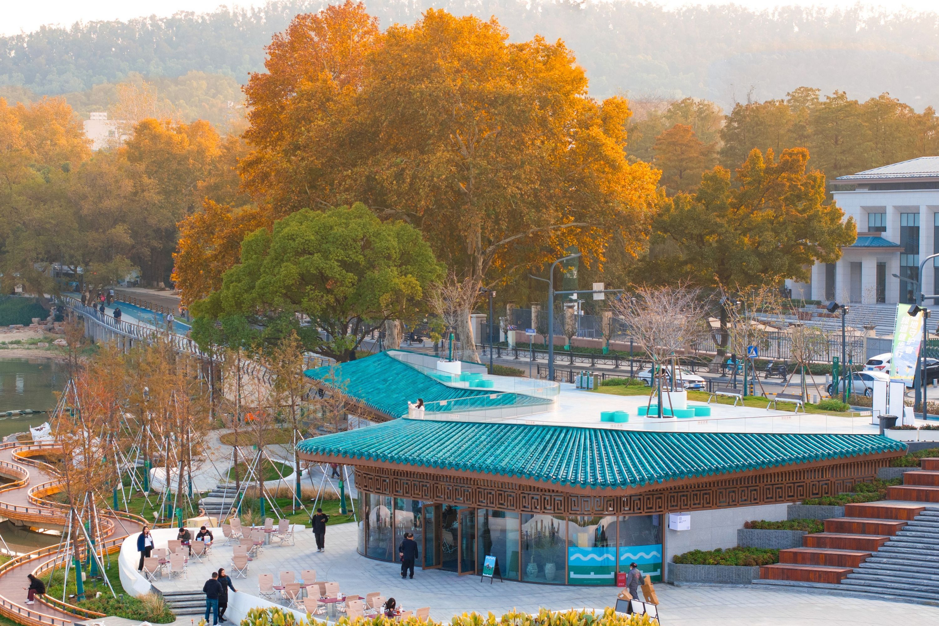 东湖绿道三期的骑行道,分别用蓝、绿两色沥青铺就,指引着往来两个方向,色彩鲜明、指示清晰。这两种色彩分别为珞珈蓝和珞珈绿,配色所用的色版,均为武汉大学提供。平湖珞樱景点的琉璃瓦,也采用了与武大建筑屋顶风格同款的琉璃瓦。
