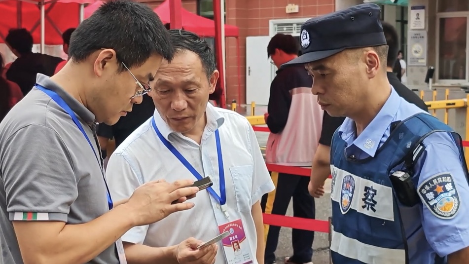 8时20分,武钢三中考点门前也发生状况,一名考生在前往考场途中不慎遗失身份证。青山公安英模背包服务队迅速响应,全国公安系统二级英模彭涛启用现场办证设备,核对身份信息、拍照、制证,全流程高效运转。短短几分钟,临时身份证便交到考生手中,考生得以顺利通过安检,按时进入考场应考。