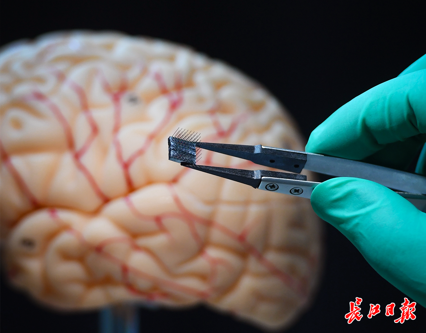 武汉衷华脑机融合科技发展有限公司,科研人员展示一枚双向植入式脑机接口系统微针阵列(资料图片)。