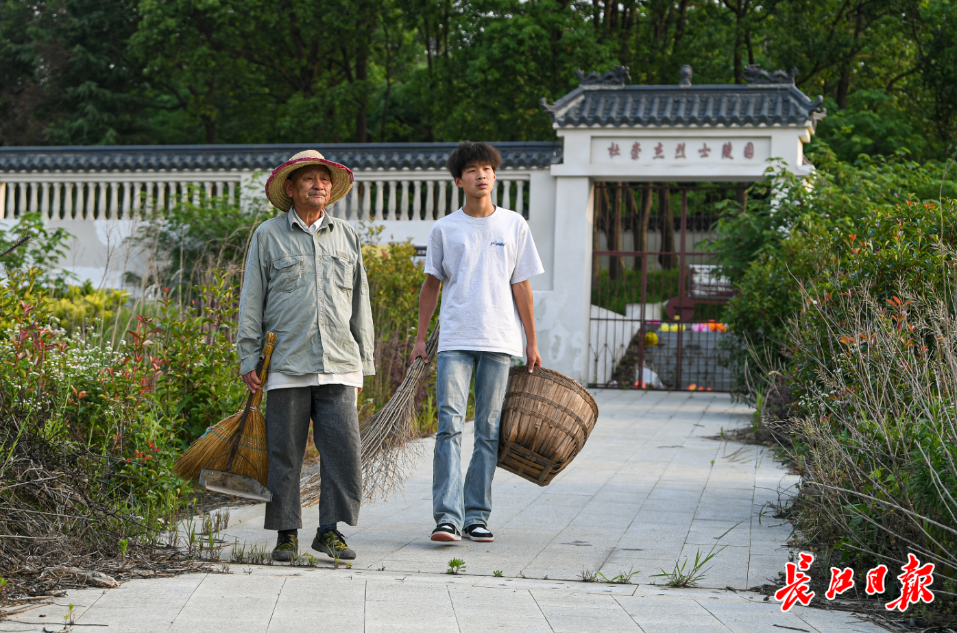 5月25日,逢周末回家的小孙子陈世博和陈金国在打扫烈士陵园。