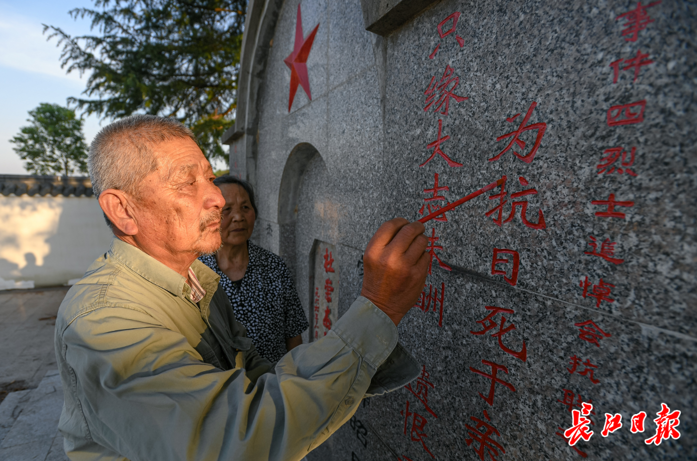 5月12日,陈金国在老伴的陪伴下,给杜崇杰烈士墓碑描字。