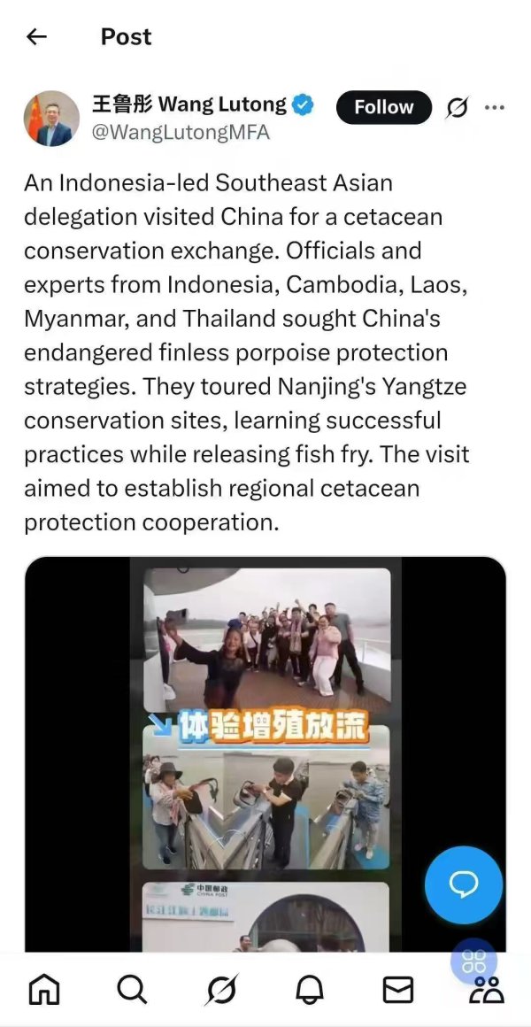 长江日报大武汉客户端6月12日讯 多个国家面临鲸豚类保护的难题,在积极探索建立社会力量参与的模式。而中国在这方面的做法得到越来越多的关注。《柬中时报》在6月9日专门刊发文章,报道中国形成政府、社会组织、企业和公众共同参与的长江江豚保护新格局。同时,中国驻印度尼西亚大使王鲁彤也在海外社交平台发布推文对此点赞。