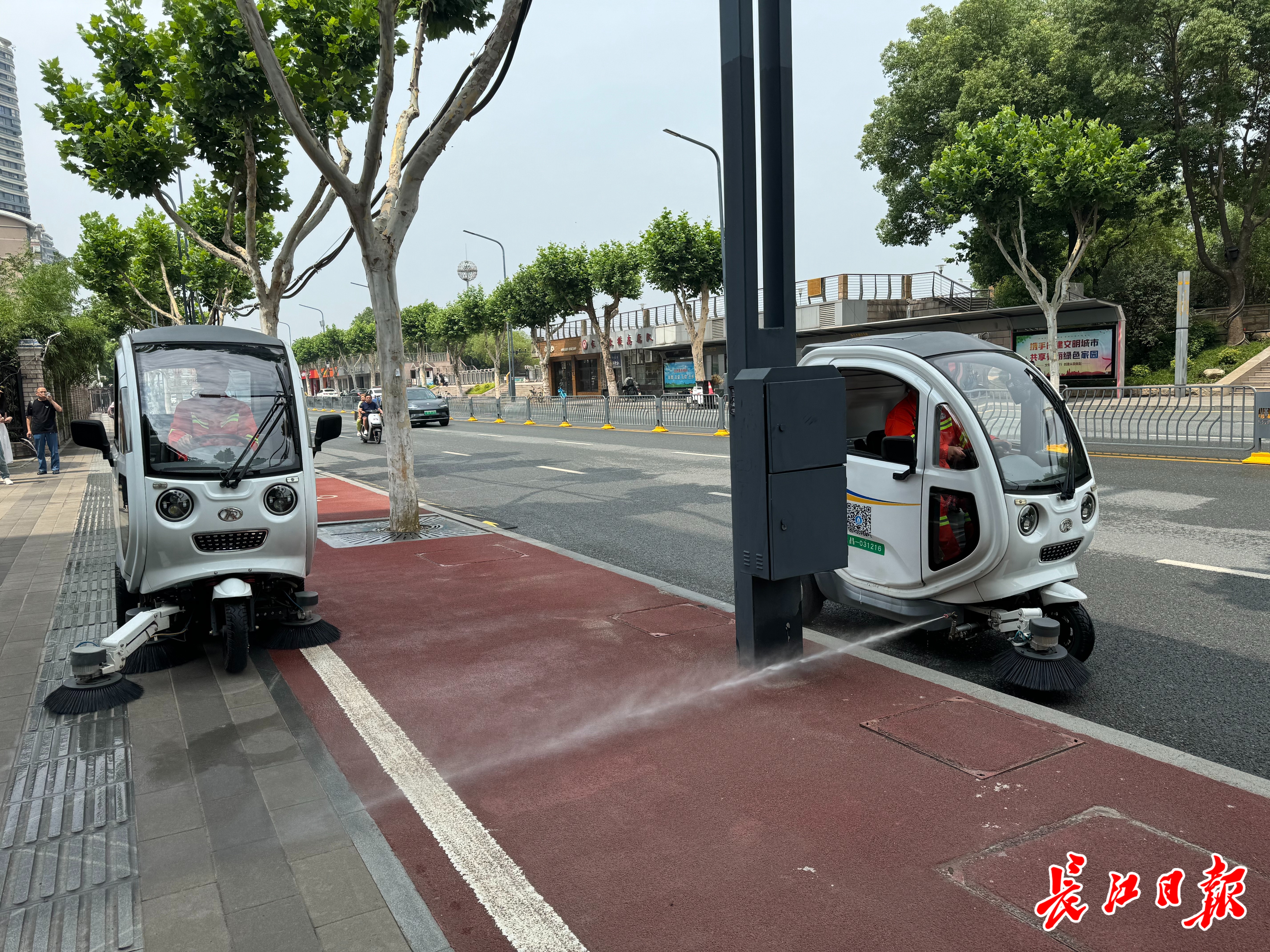 武昌临江大道,两名环卫工人驾驶电动清扫车清洁人行道。记者陶常宁摄
