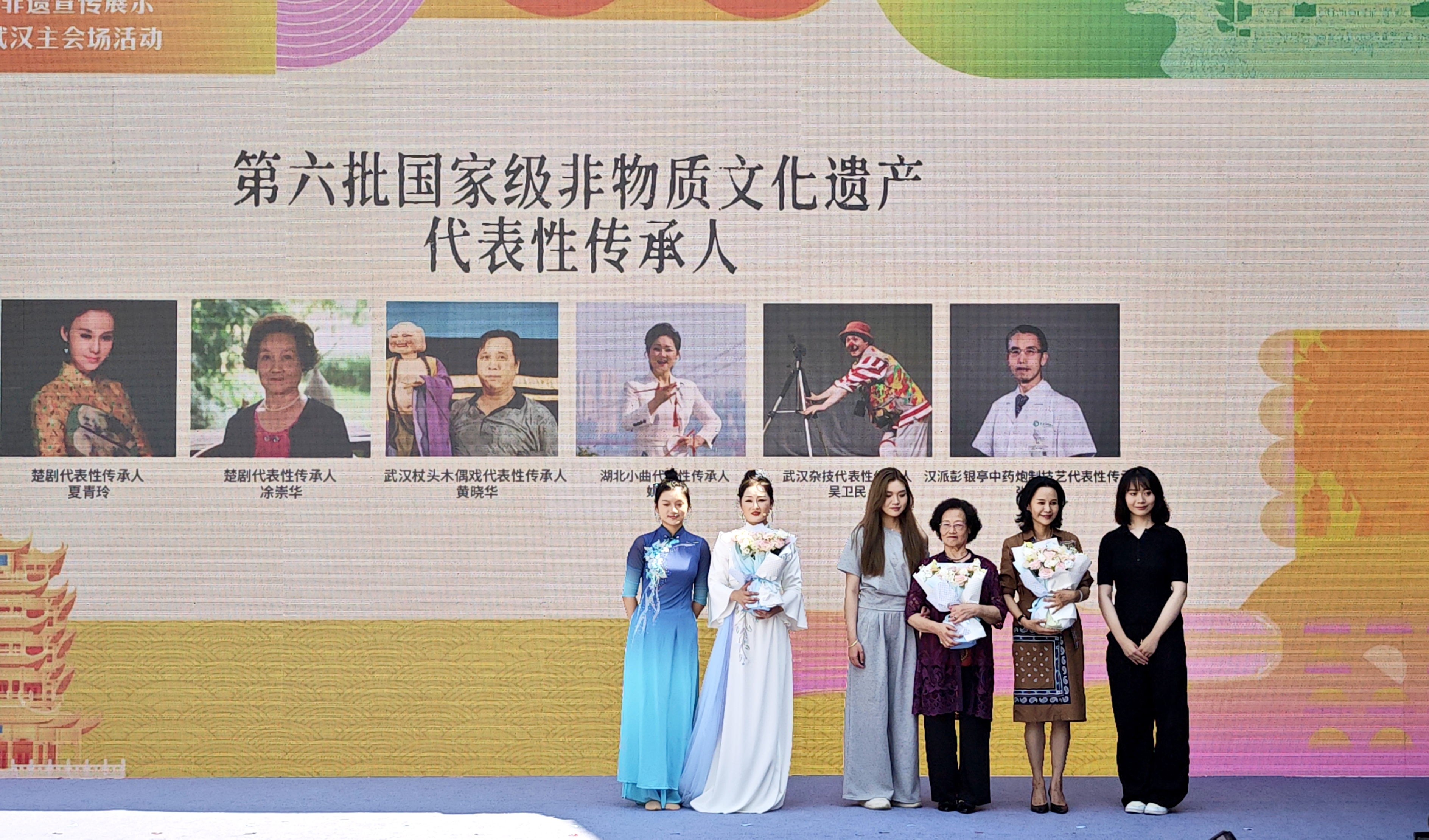 新晋第六批国家级非物质文化遗产代表性传承人代表也来到现场,徒弟们向老师献上献花,象征着非遗的薪火相传。今年3月份,文旅部公布了第六批国家级非物质文化遗产代表性传承人名单,武汉市楚剧代表性传承人夏青玲、楚剧代表性传承人凃崇华、武汉杖头木偶戏代表性传承人黄晓华、湖北小曲代表性传承人姚俐玲、武汉杂技代表性传承人吴卫民、汉派彭银亭中药炮制技艺代表性传承人张义生6人入选,至此武汉国家级非遗代表性传承人总数达到24人。