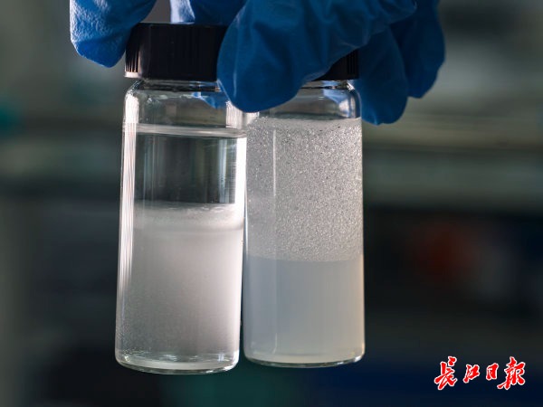 对比实验测试甲壳素纳米晶亲水、亲油的特性,右侧加入了甲壳素纳米晶,与油性物质混合摇匀后,会变成不易溶解的泡泡。