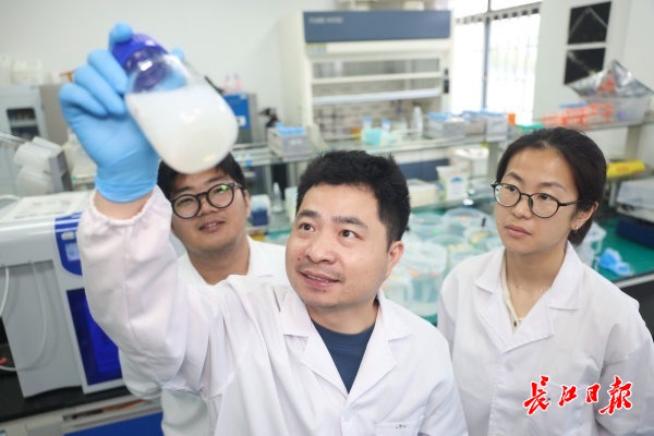 刘培文团队察看新制成的甲壳素纳米晶的成色。