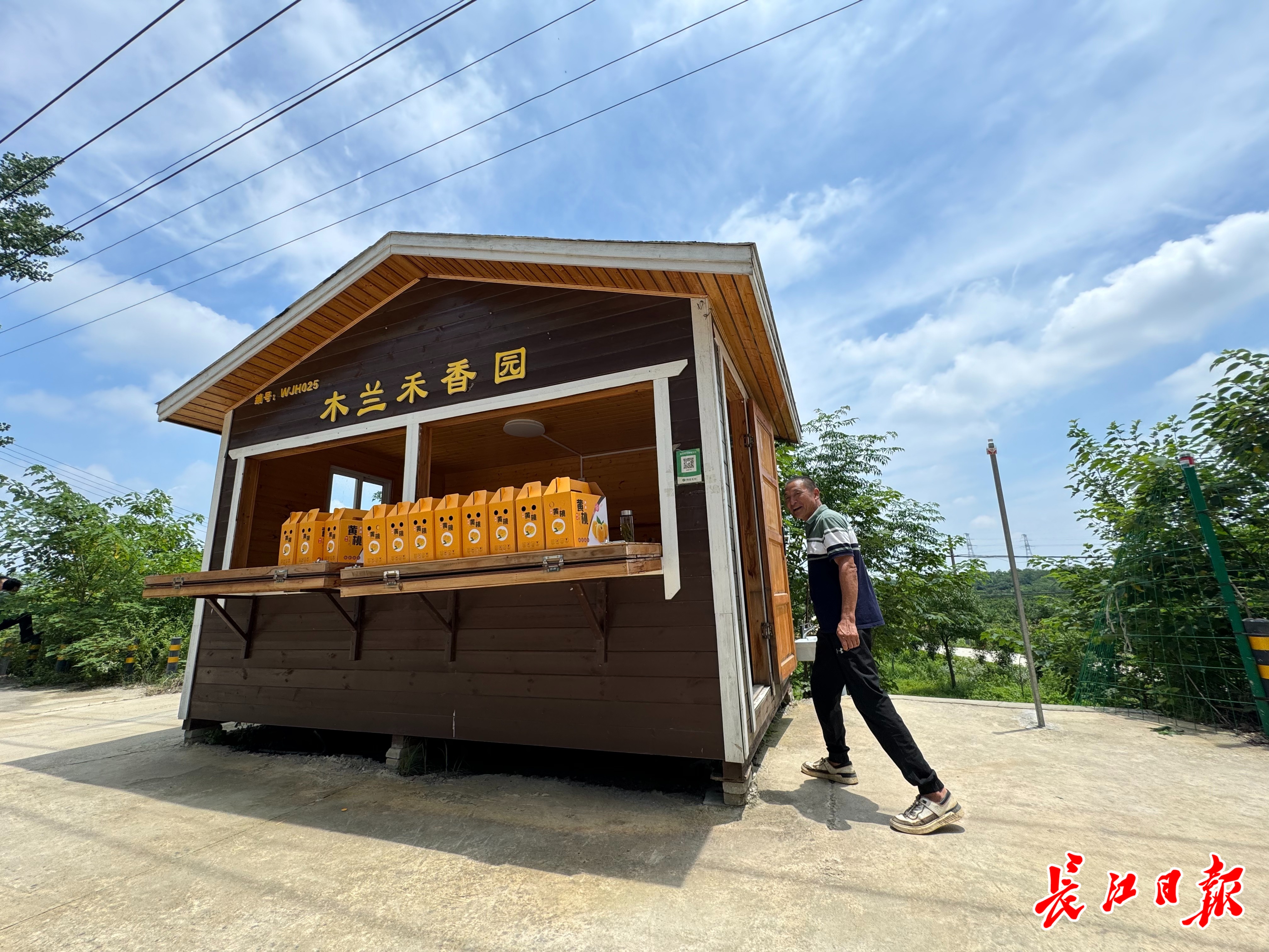 “以前路边摆摊,撑个伞不好看,车子从旁边呼啸而过,也不安全,有了这个小木屋,环境变好了,刮风下雨、风吹日晒都不怕。”果农张爱国带记者来到瓜果售卖亭内,只见里面整齐码放着一箱箱刚采摘的黄桃,还放着货架、板凳、水杯等。