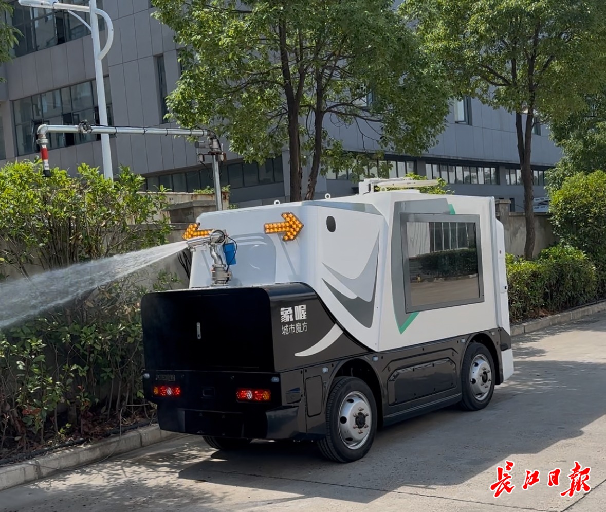无人清扫车刚刚驶离,一款名为“象喔”的无人洒水车又行驶过来,只见它精准地停靠到智能补水站伸出的水管下,自动打开车顶的盖子,水流哗啦啦灌进车辆的“大肚子”里。不一会儿,灌满水的车辆缓慢沿路边行驶,车尾部的水枪喷洒出水雾均匀喷洒到路面上。