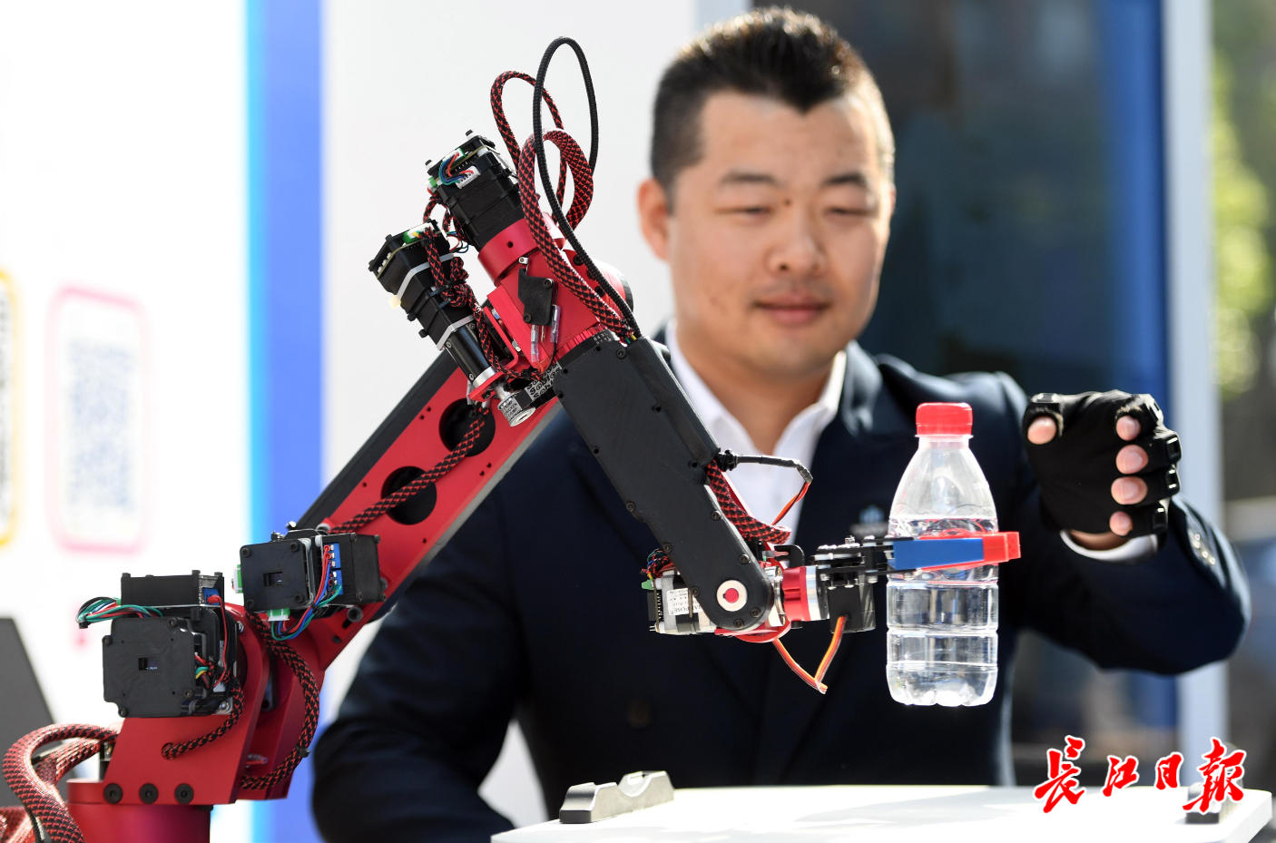 灏存科技CEO熊鹏航戴着人工智能数据手套进行人形机器人动作训练。长江日报记者高勇摄