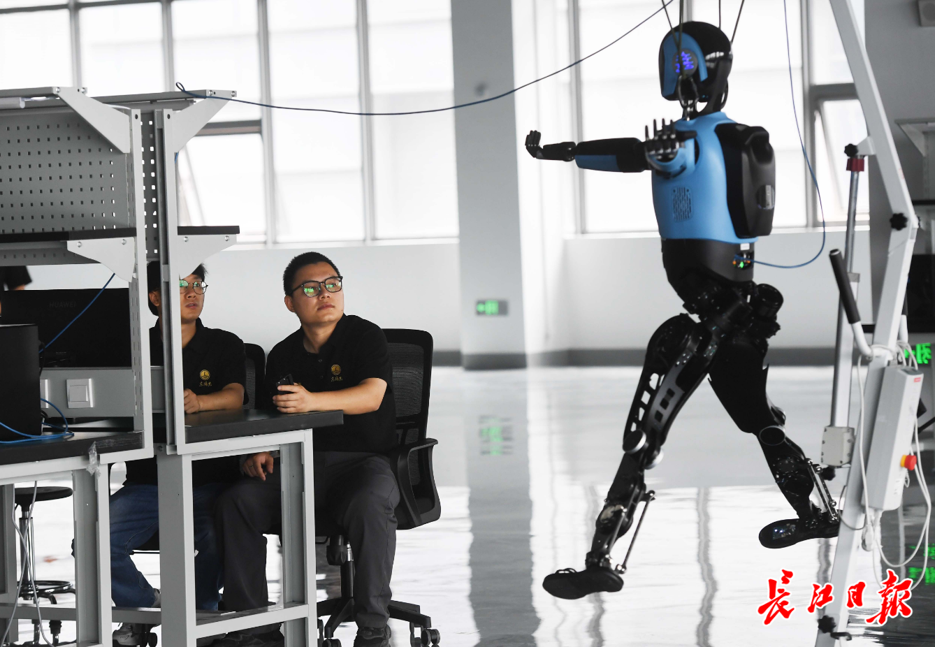 在光谷东智人形机器人生产车间,研发人员正在调试优化人形机器人。长江日报记者高勇 摄