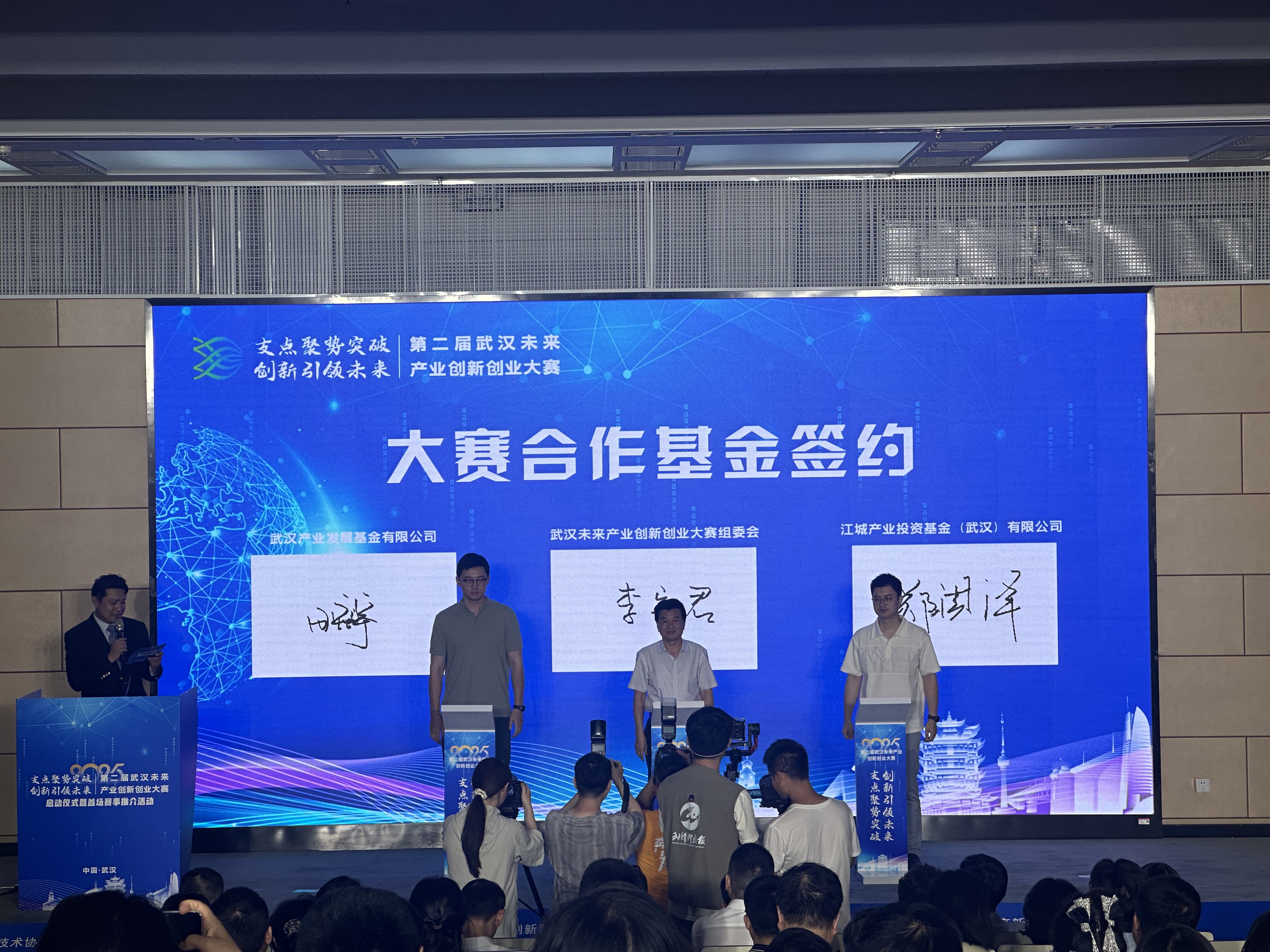 大赛组委会与武汉基金和江城基金现场签约。记者冯雪 摄