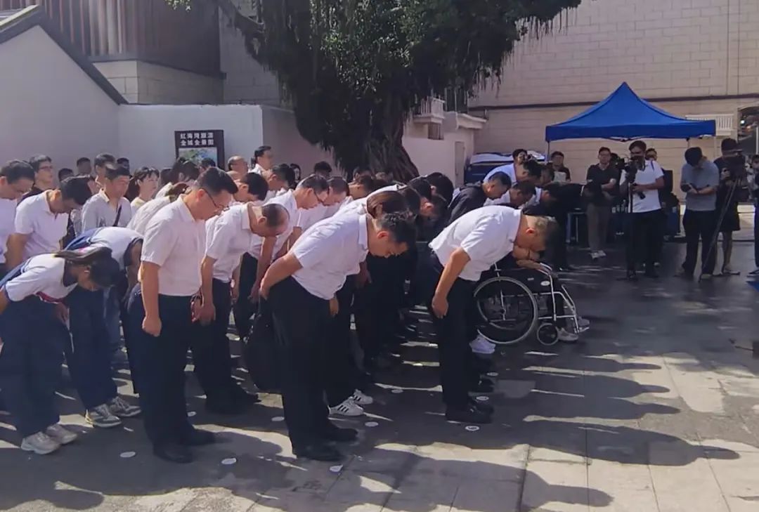 9时,人们在黄旭华院士少年时代求学成长的红楼前举行了追思仪式。现场,黄旭华院士的遗像摆放在红楼大门前,黄旭华院士家人和生前同事、好友以及家乡干部群众、师生代表一起深情回顾了他的一生。随后,大家一起进入红楼参观纪念黄旭华院士生平事迹展。
