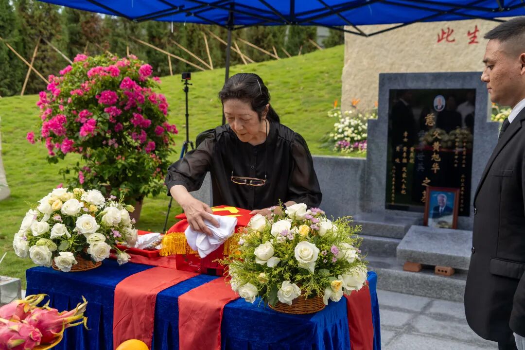 10时,骨灰安放仪式开始。亲属代表擦拭墓碑后,将黄旭华院士的骨灰安放进墓穴。参加仪式的人员向黄旭华院士墓碑行三鞠躬礼,并敬献鲜花。