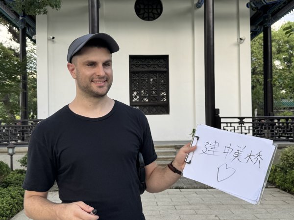 美国留学生凯佑写下心愿:建中美桥。实习生叶文威 摄