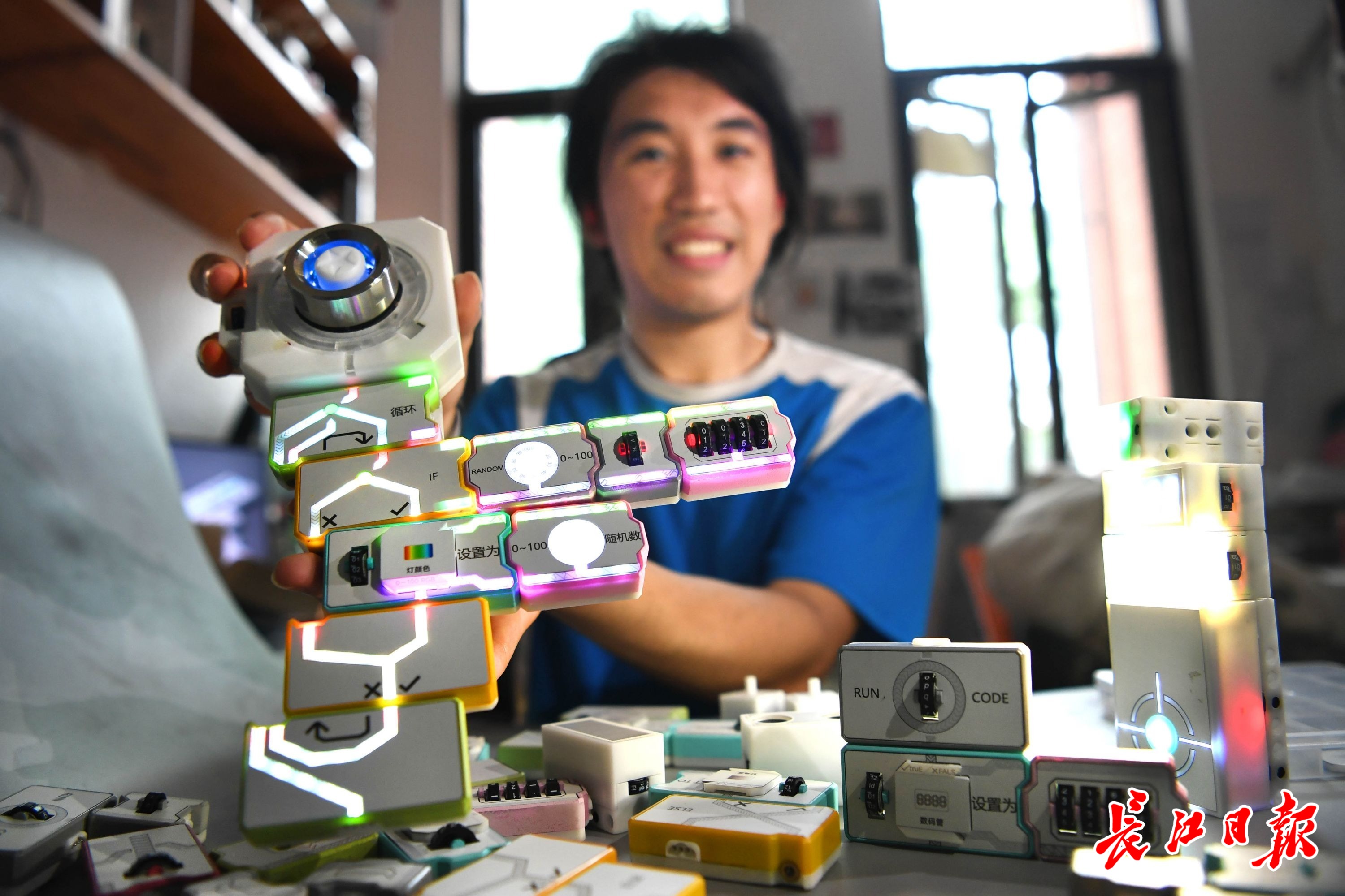 在武汉大学大学生工程训练与创新实践中心创客工场,长江日报记者看到,这些可以像积木一样拼搭的编程机器人模块像被施了魔法:最大的“指挥台”搭载着旋钮,转动就能让代表程序的小光点在一个个状似冰块的模块上“跳舞”;其他“冰块”也各有神通,有的能让灯忽明忽暗,有的像长了眼睛,能感知周围变化。