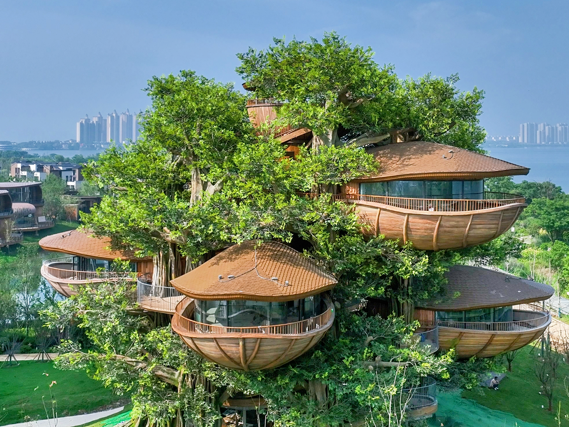走进度假乐园,两棵20多米高的榕树枝叶茂盛,像两把撑开的巨大绿伞。树干里、密叶间,各藏着6间“豆荚小屋”。