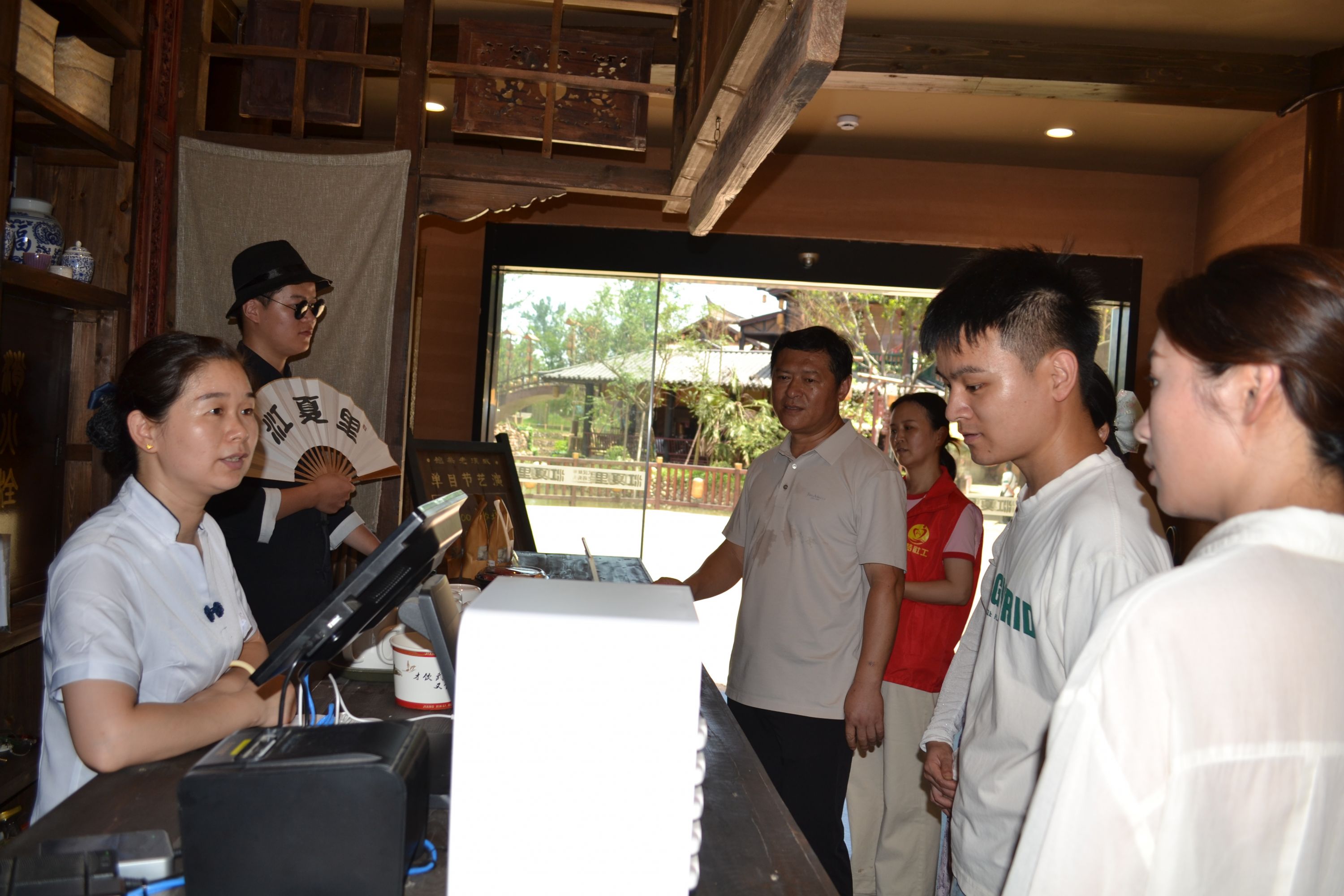 6月30日,刘兵(左三)带领部分村“两委”成员,在江夏里·武汉老码头文化美食街走访店铺,了解情况。记者蒋太旭摄