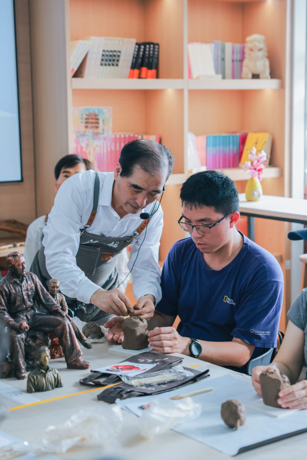 武汉黄陂泥塑市级代表性传承人“泥人胡”胡作林带领汉台青年代表制作泥塑。 刘雍涛 摄