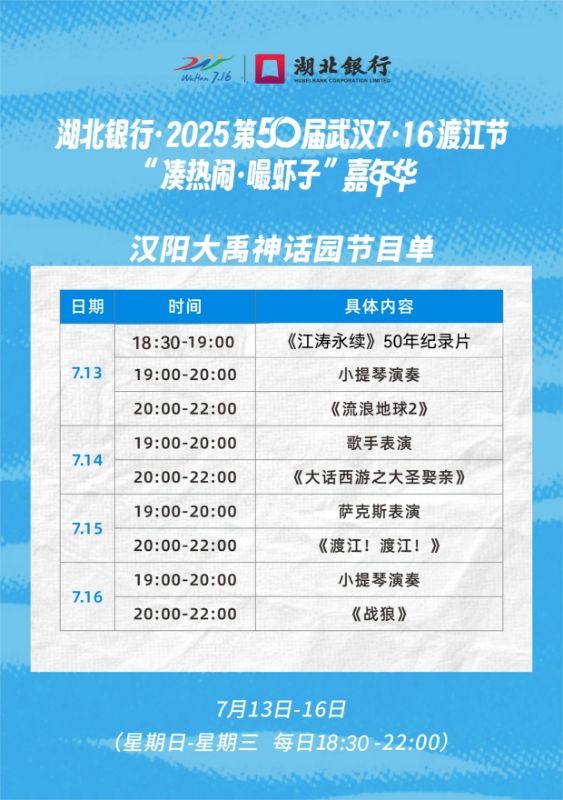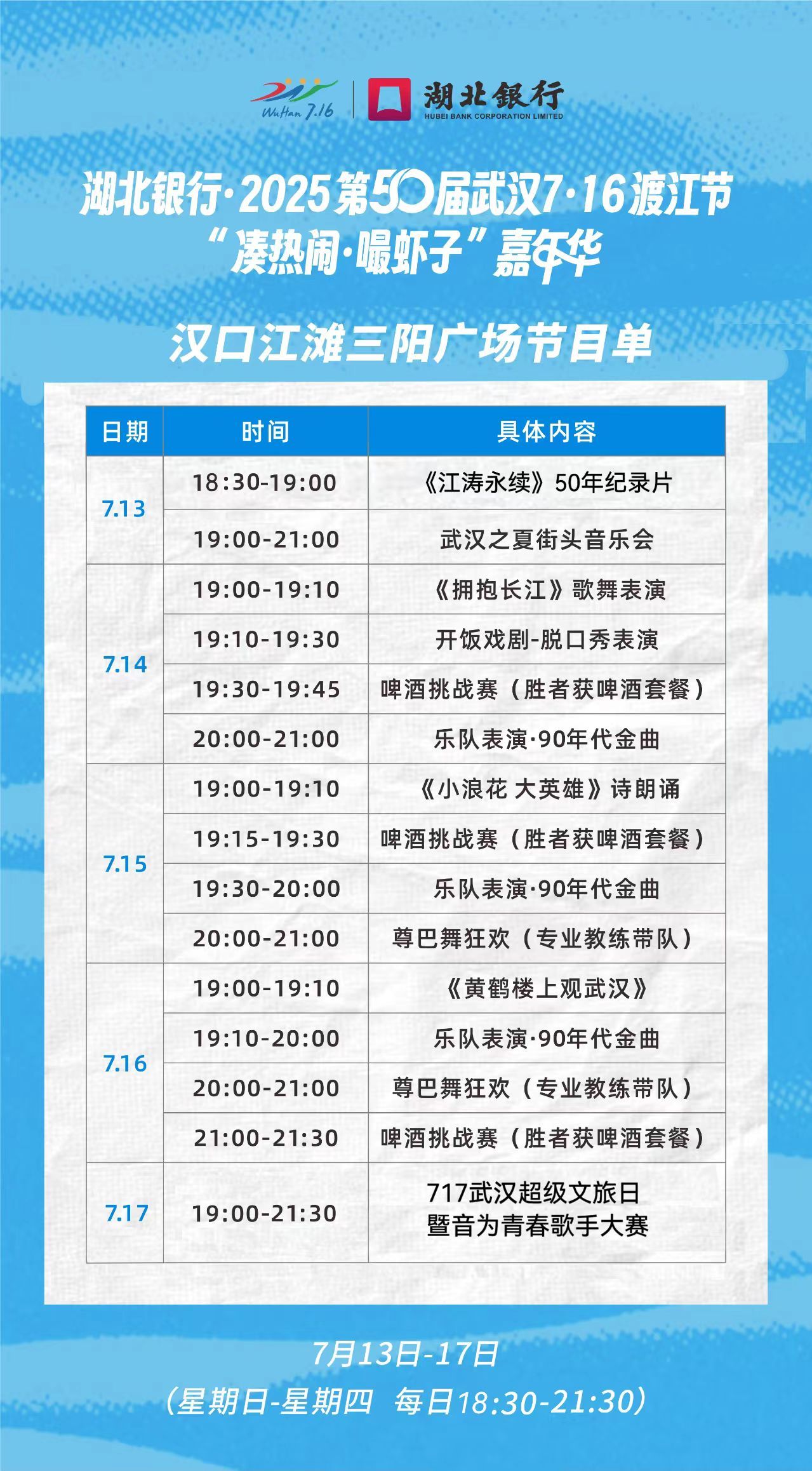 7月16日,湖北银行·2025第50届武汉7・16渡江节将正式开幕。届时,70名通过资格测试的运动员将从武昌汉阳门码头入水,向着游程约1800米处的终点汉阳南岸嘴方向抢渡,争夺个人抢渡比赛男子组和女子组的名次;2000余名游泳爱好者组成的27支方队,也将沿着从武昌汉阳门码头到汉口江滩三阳广场的路线浩浩荡荡横渡长江,游程约6000米。