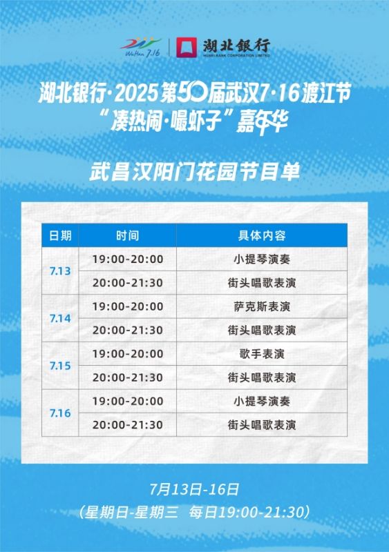 围绕本届渡江节,组委会还策划了精彩纷呈的系列活动,营造全民参与的热烈氛围。7月13日17时,渡江嘉年华活动在汉口江滩三阳广场正式启动,武昌江滩、汉阳江滩的渡江嘉年华活动也同步举办,现场既有让人垂涎的特色美食,也有独具匠心的文创好物,还有超燃的现场氛围。