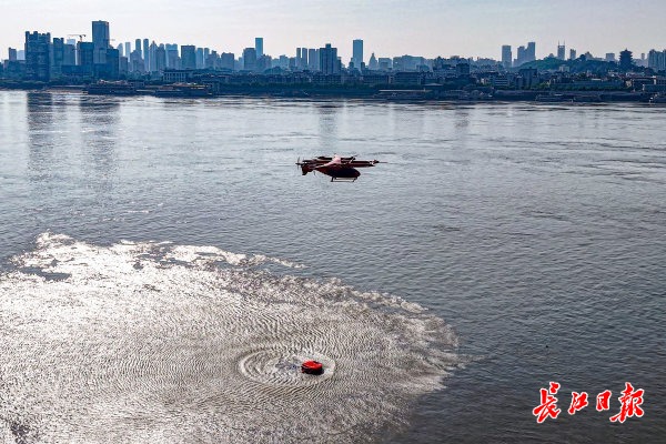 8时22分,工作人员收到来自江面的模拟求救指令。按下起飞按钮,这架eVTOL航空器便迅速垂直升空,按照提前设定好的航线,跨越龟山,自动向长江方向飞行。8时23分,eVTOL 航空器在轰鸣声中到达江面上空定位点。