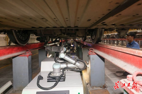 如今,动车段检修库内,一台自带三个机器臂的“大块头”在动车组车底来回穿梭,灵巧地执行动车组车底检修任务。它是动车组智能巡检机器人,武汉动车段今年正式投入使用的高科技产品。它集传感技术、机器视觉人工智能算法于一身,能够准确标识故障位置生成二维图像、三维点云图像形成系统报告。对于车底磨耗部件,其测量精度已满足日常运用要求。在确定动车组停靠位置信息后,它可以自动完成全列动车组检测、自动回原点、自动充电,全程无需人工干预。经过一系列模拟训练,动车组智能巡检机器人故障识别率达到95%,能在复杂光线环境下识别18种常见的故障类型,进行190余项故障检测。高温的夏天有了它,大大减少机械师在动车组底部的作业时间。