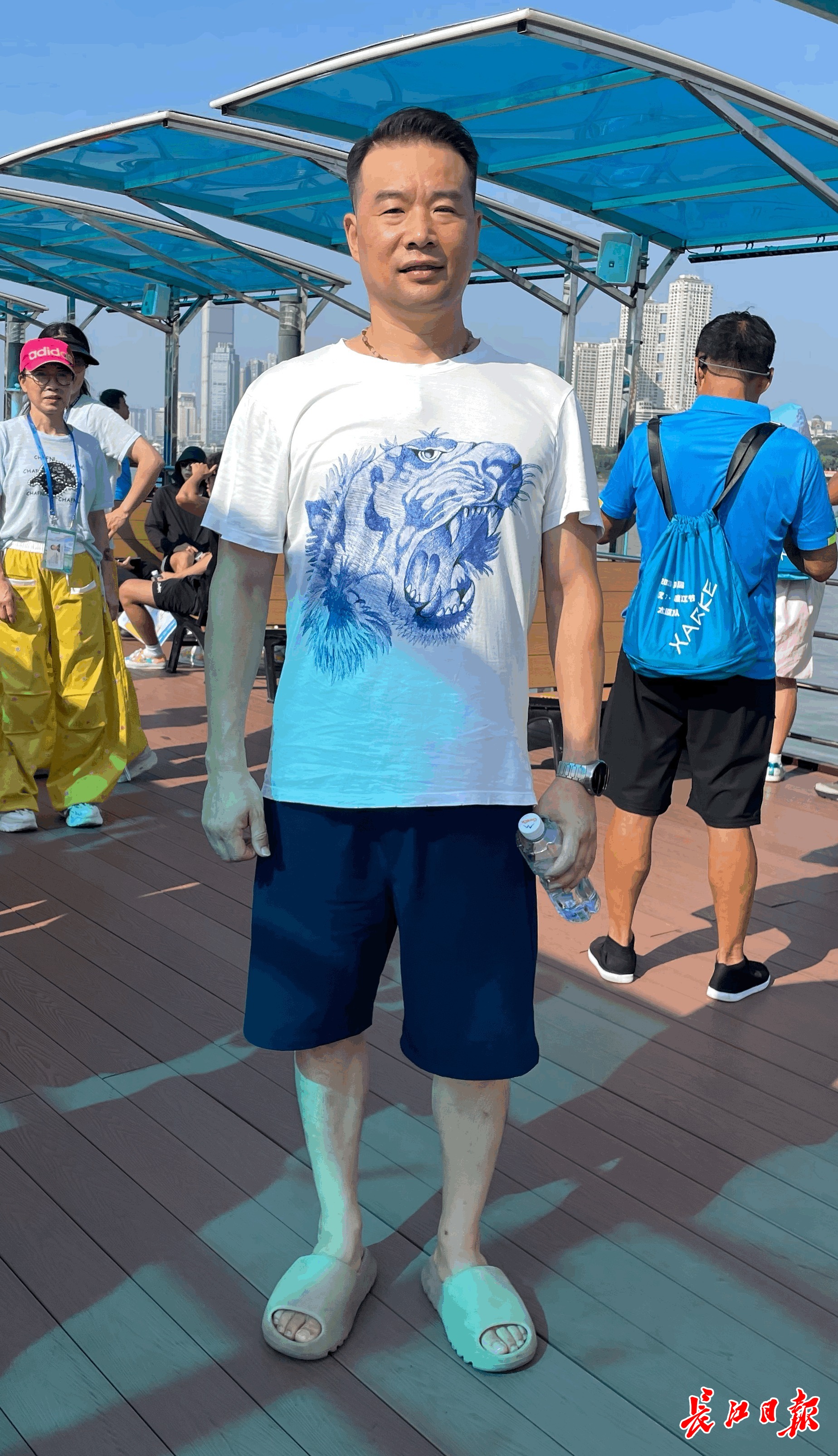 刘翔今年46岁,从事婚庆行业,连续三年参加武汉渡江节。因工作关系和家庭爱好,他常来武汉游玩。