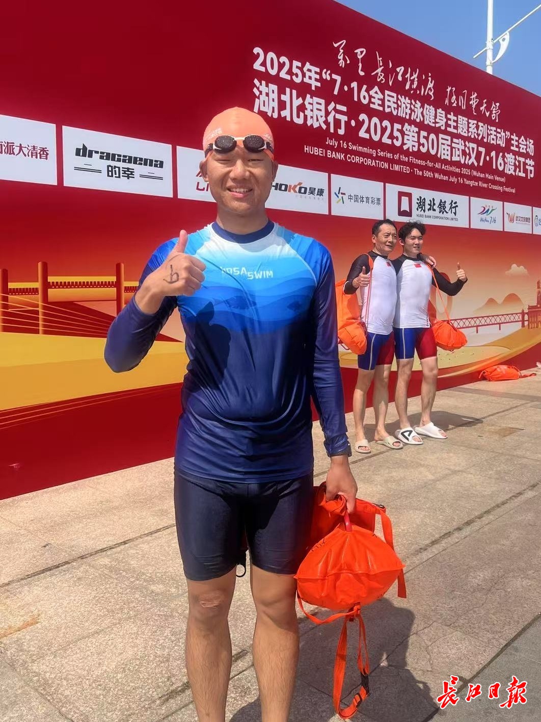 长江日报大武汉客户端7月16日讯(记者商佩 实习生李正越)“今天水速比较缓,我游得非常开心、非常好!”7月16日9时50分,洪山区方队在汉口江滩三阳广场起水上岸后,队员吴浩面对镜头喊话:“我在长江里游了30年泳,如果今天潘展乐来了,我绝对比他游得快!”