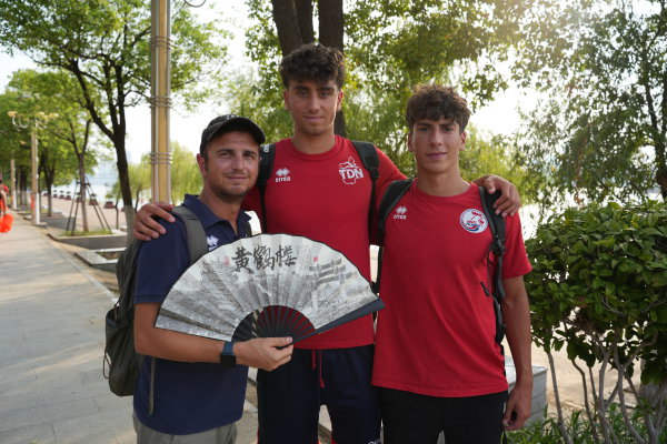 意大利阿斯蒂省代表团教练保罗手持“黄鹤楼”题字的纸扇,与小将斯特凡诺·卡内拉(右)及托马索·达多内合影。实习生孙奕文 摄