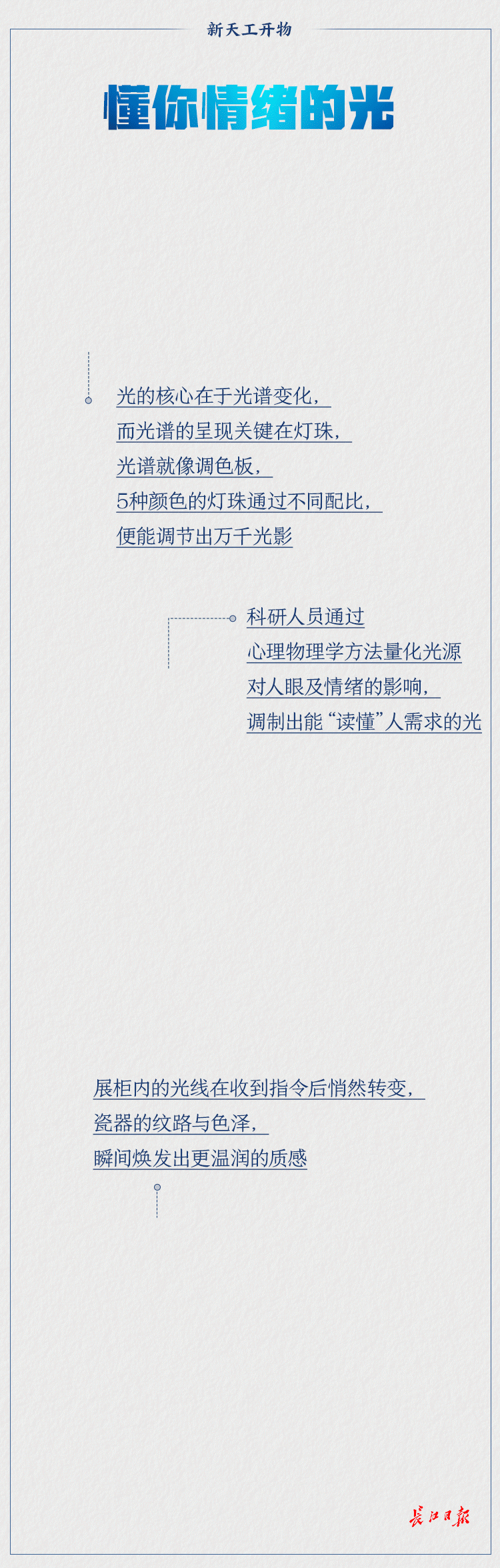 你看这个玻璃展柜,随着我根据自己的感觉发出调整光的指令,展柜内的光线悄然变化,展陈瓷器的纹路与色泽会瞬间焕发出更温润的质感。你会发现,文物照明的光线恰到好处,这正是我们调制的人工光源。中国国家博物馆的文物照明就采用了我们的技术。这种让人感觉“恰到好处”的光源是如何产生的呢?