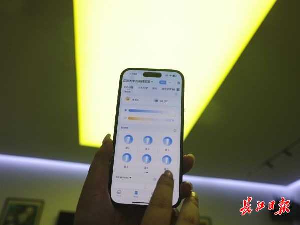 光品质与颜色视觉联合实验室,通过手机APP调节不同颜色不同程度的光,图为自定义设置的绿光。记者 胡冬冬 摄
